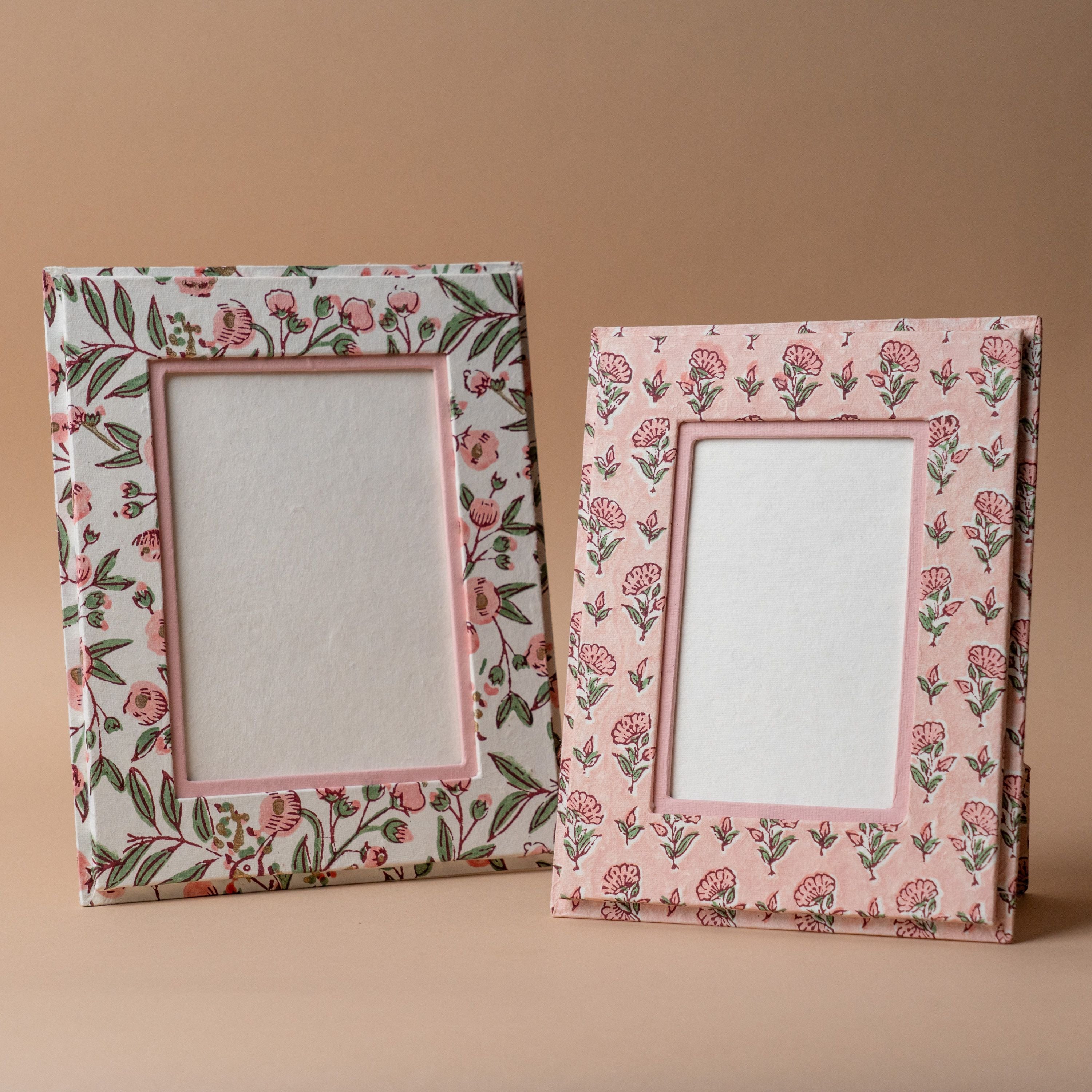 Beautifully handcrafted from recycled cotton rag paper, this picture frame celebrates both artistry and sustainability. Each piece features hand block-printed floral designs using time-honoured techniques passed down through generations. The subtle variations in every print ensure no two frames are identical, adding genuine character to your space. Made in small batches, this frame honours the slow art of craftsmanship, bringing warmth, organic texture, and vibrant colour to display your cherished memories with intention and meaning.