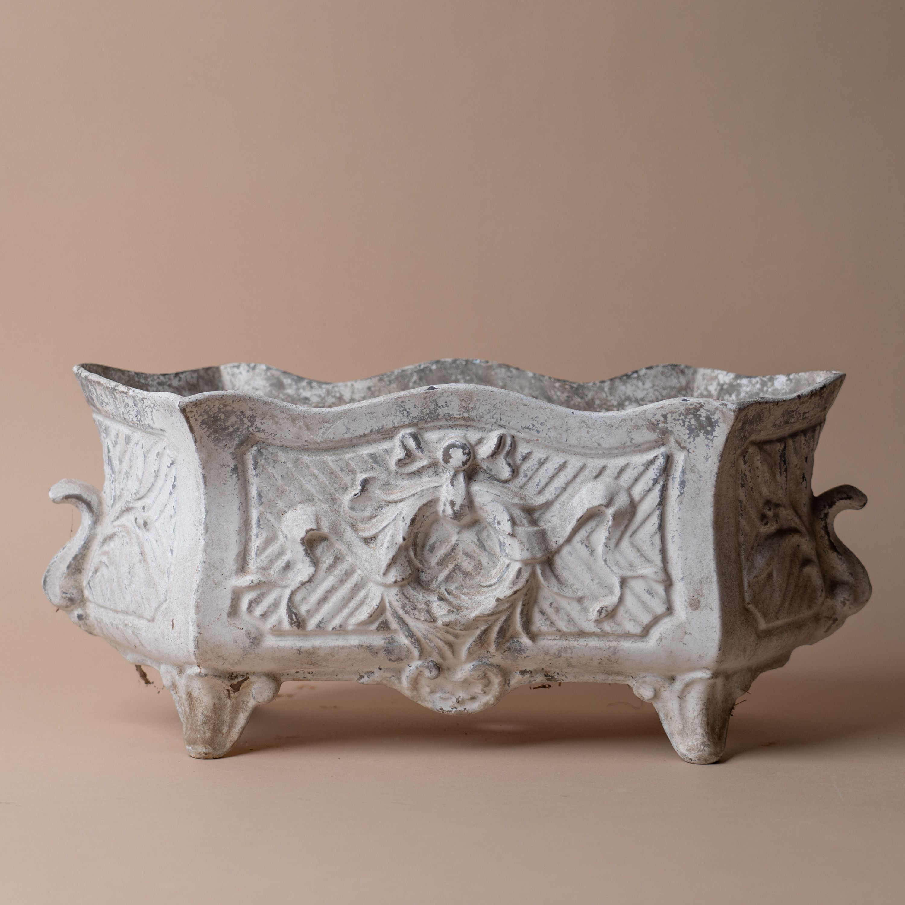This exquisite antique French plant trough showcases timeless elegance with its intricately detailed mouldings and ornamental carvings. Crafted from heavy-duty cast iron, it's built to withstand the elements and last for generations. The substantial weight and robust look make it ideal for displaying your favourite plants while adding sophisticated European charm to gardens, patios, or interior spaces. A stunning statement piece that combines durability with refined aesthetic appeal.