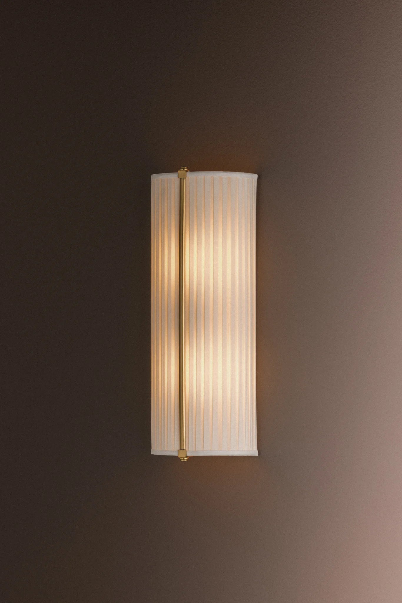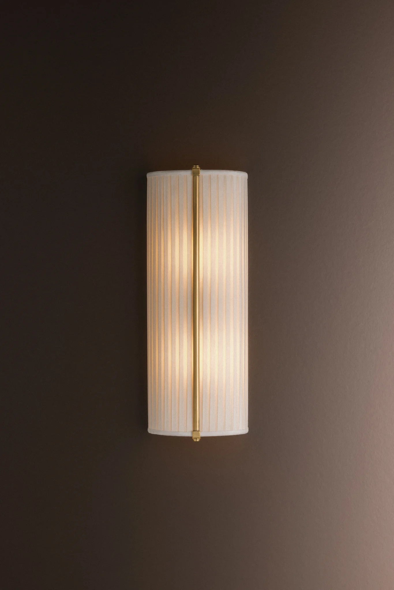 The Cornell Wall Sconce brings together graceful design elements with understated elegance. Its hand-pleated silk shade is framed by delicate vertical rods finished in warm Aged Brass, creating a refined aesthetic that complements modern and classic spaces alike. Choose between a single-light option for intimate corners or a dual-light version for broader wall coverage. With its balanced proportions and versatile style, this sconce serves as a beautiful focal point that enhances any transitional room with both function and visual interest.