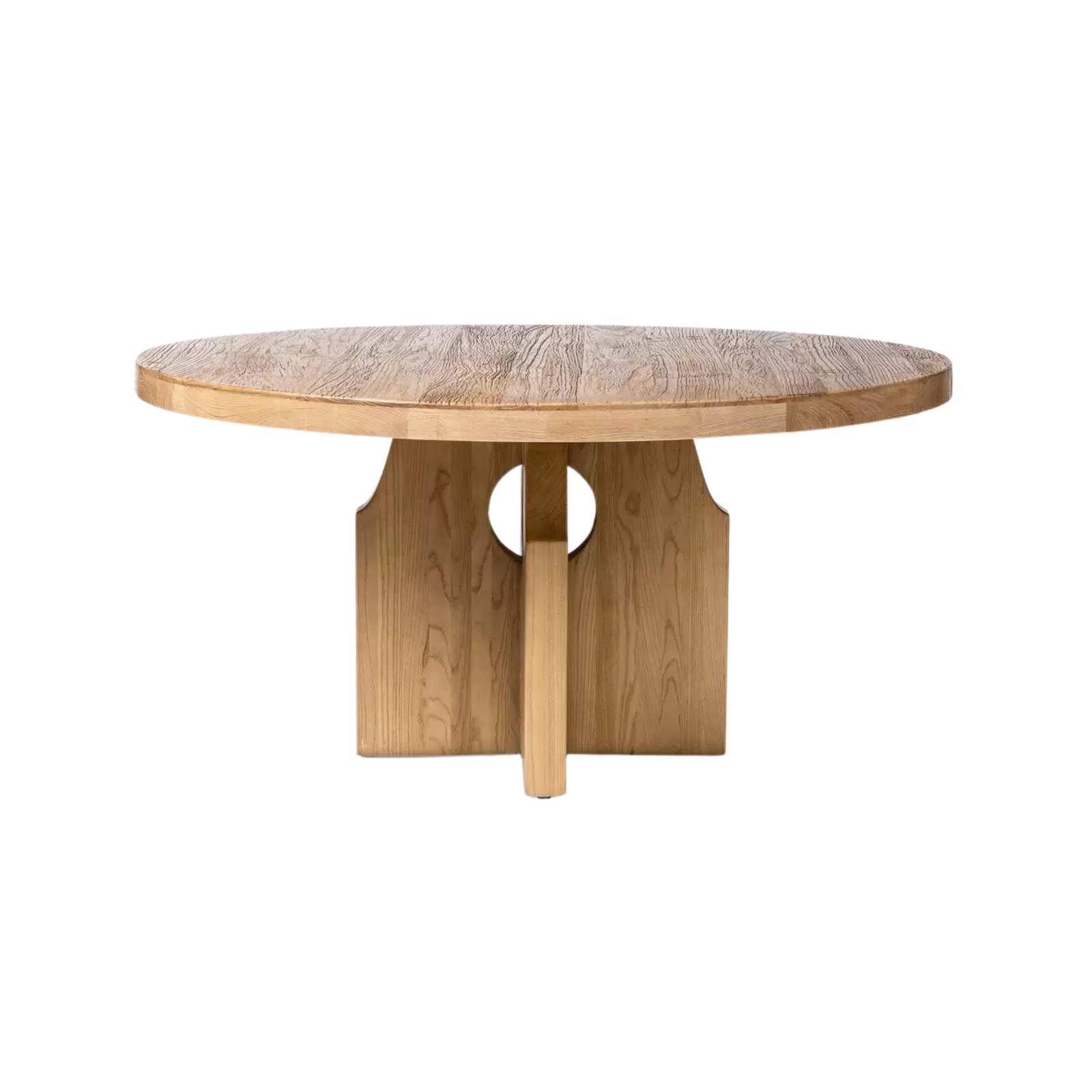 Discover the allure of Swedish Gustavian design through our Allan Round Dining Table. Utilizing natural elm and wire brushing for added texture, this table showcases a rounded tabletop and sleek cutout base. Seating up to six with ease, it's an ideal complement to any dining area. Its innate warmth and cozy ambiance make it a wonderful addition to your home.