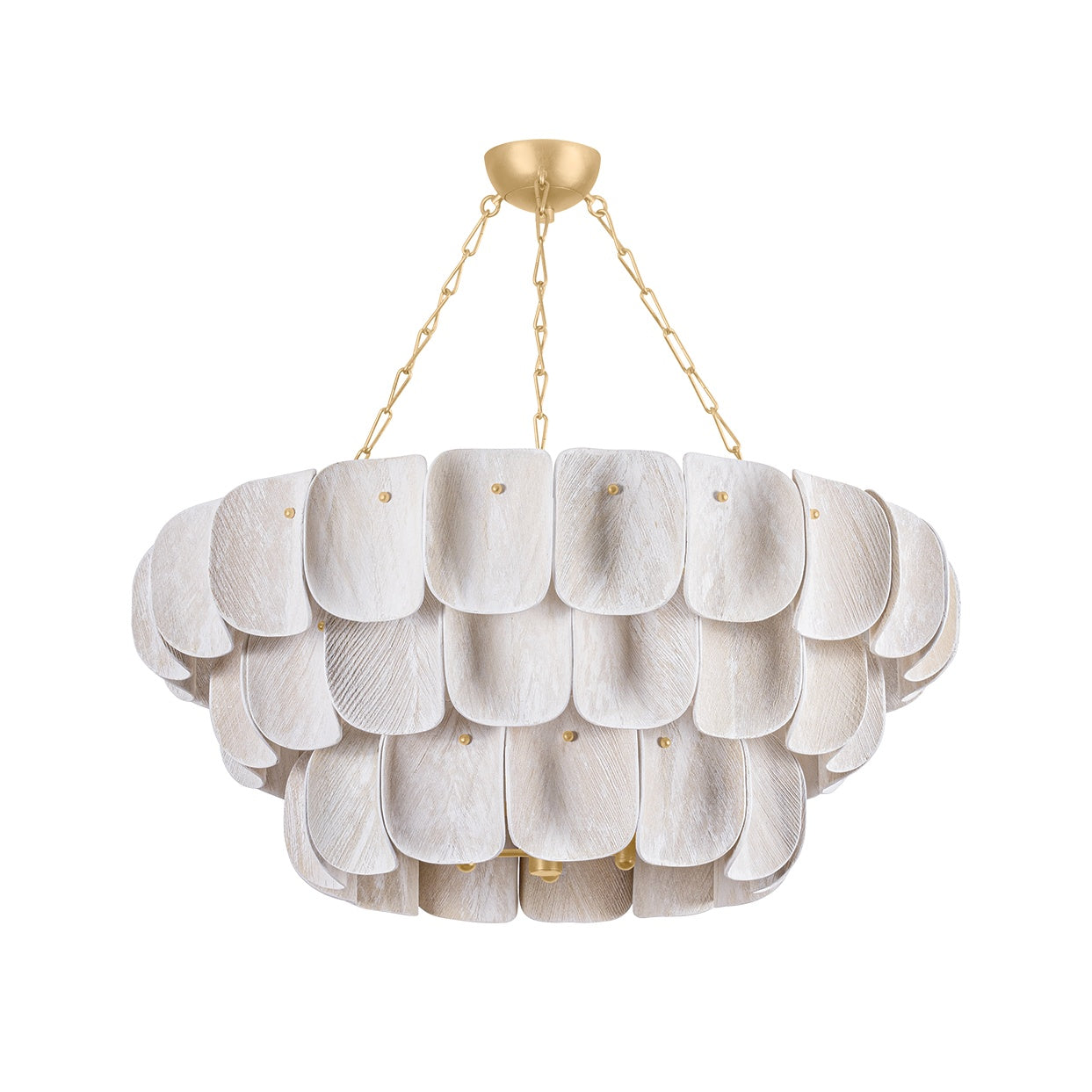 The organic materiality and layered silhouette of the Amalfi chandelier bring a dose of freshness to any space. Made of natural coco fiber, the textural shade panels curve gently outwards like petals. Adding depth and dimension, the tiered shape of the silhouette allows light to escape at each level. The Vintage Gold Leaf finish on the metalwork lends a jewelry-like aesthetic, complementing the beauty of Amalfi.