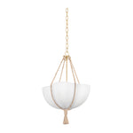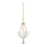Celebrating the beauty of natural materials, the sophisticated Amberley pendant features a unique natural rope suspension and ethereal opal matte glass shade. Resembling a quatrefoil shape from above, the shade has four scalloped edges that nod to its botanical underpinnings. From the ceiling, the rope cradles the shade, culminating in an elegant tassel at the bottom. A central stem finished in Vintage Gold Leaf adds to the warm tonality of Amberley.