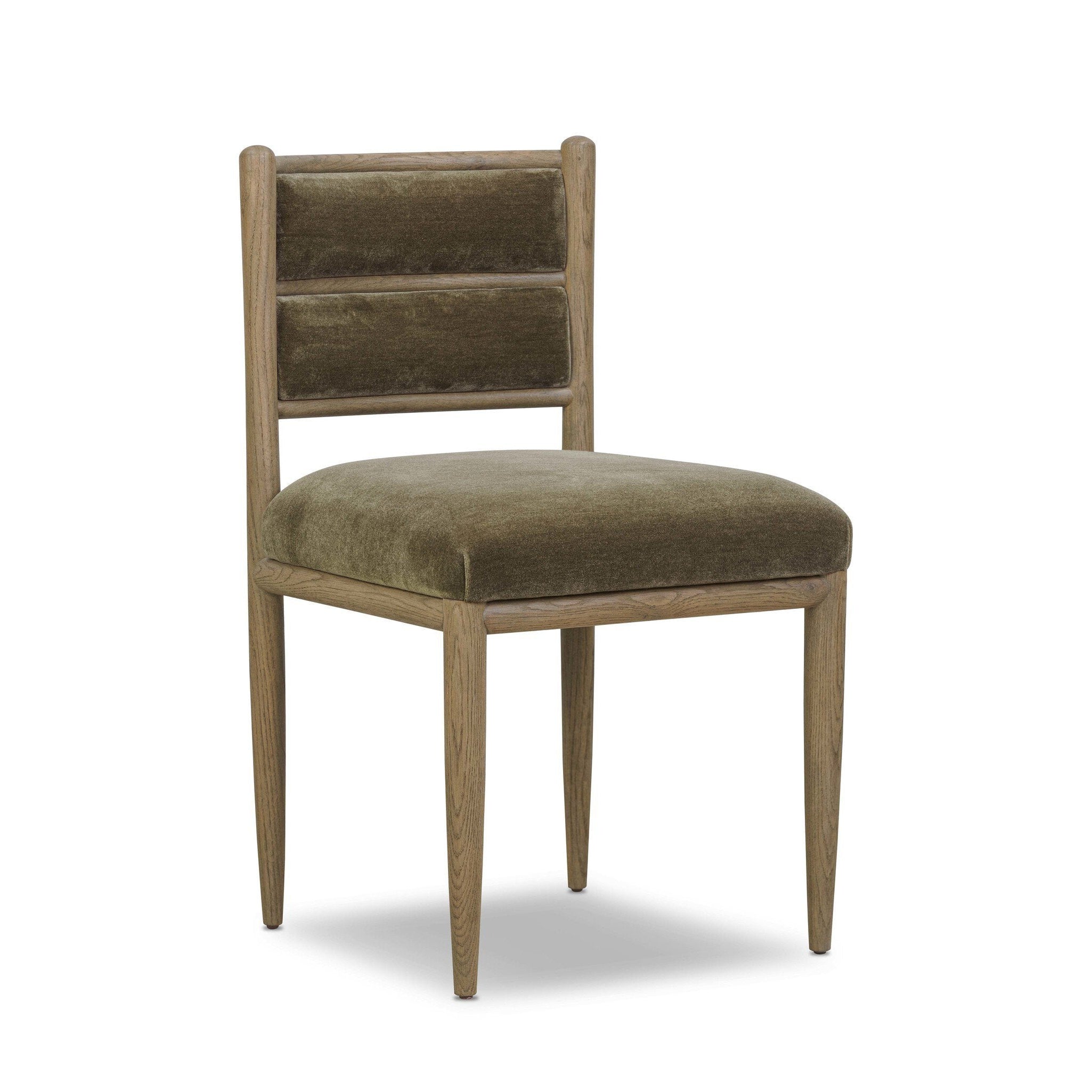 Channeled tufting adorns this sophisticated dining chair, drawing inspiration from Art Deco craftsmanship. The substantial construction features plush tufted upholstery paired with warm amber wood legs that taper gracefully, delivering both refined style and enduring comfort. A statement piece that balances vintage aesthetics with contemporary design sensibilities.