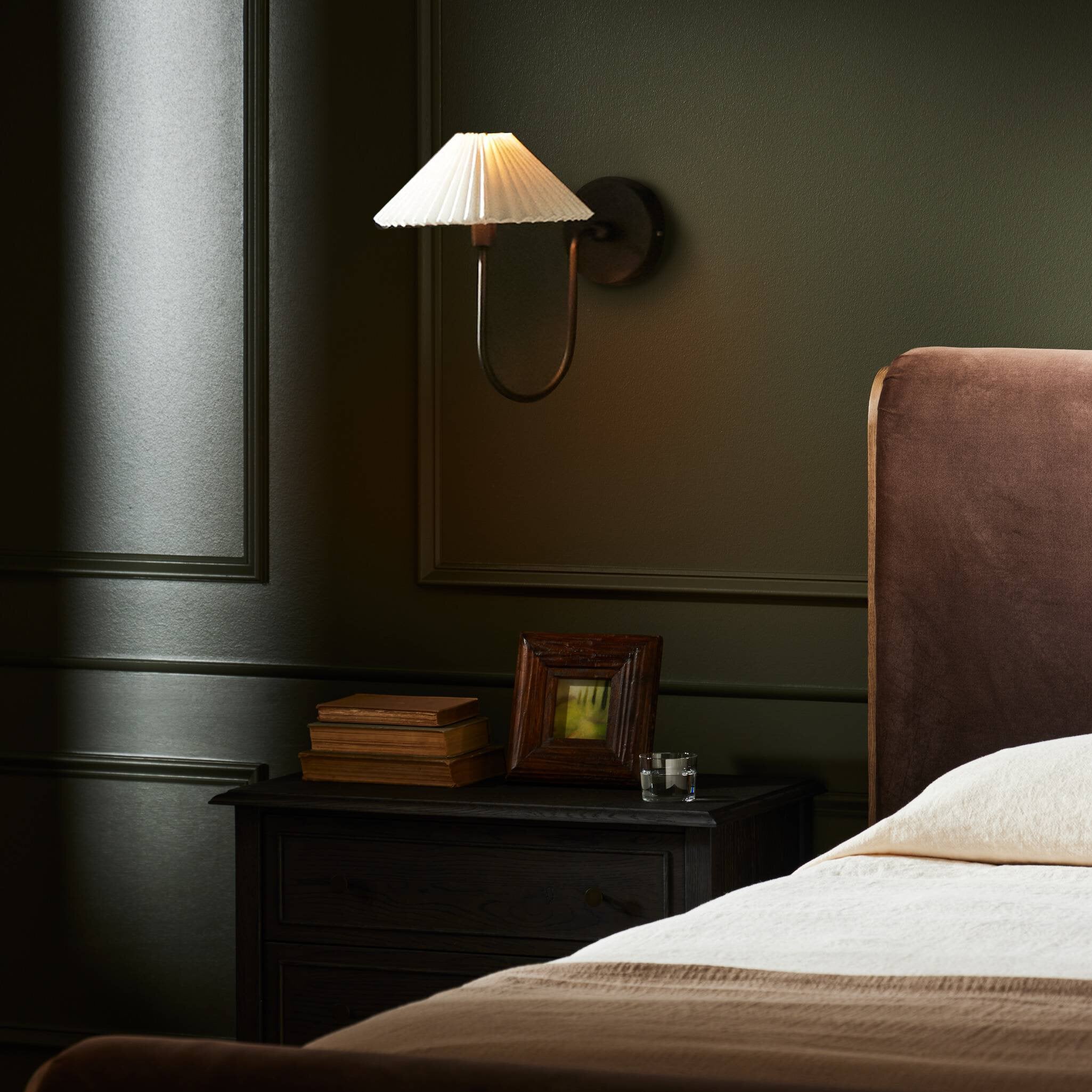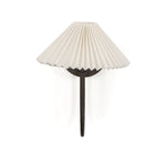 French inspiration courses this slim sconce, as a curved bronzed arm extends from an iron backplate. Cream, accordion-pleated linen shade allows for a softened, more ambient light. T6 bulb recommended.