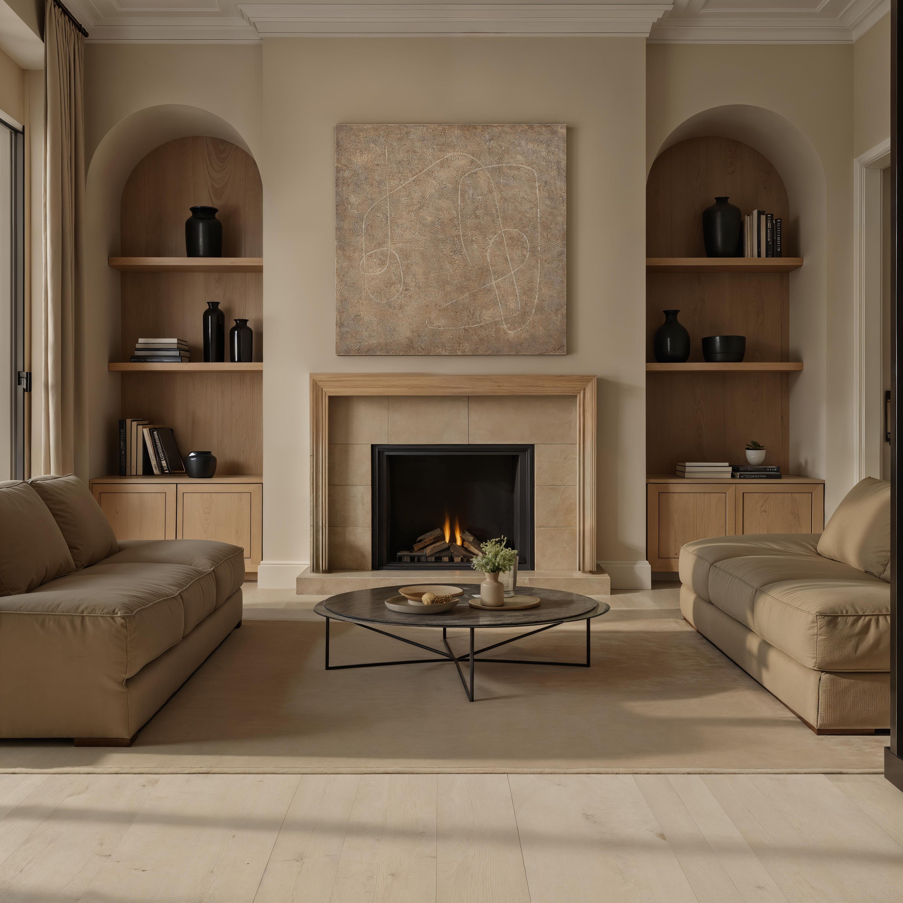 With a minimalist design and classic color scheme, this contemporary canvas art makes a striking statement in any modern space. Hand-painted on premium cotton canvas with a seamless edge, this frameless piece exudes a gallery-quality sophistication that enhances the ambiance of any room it adorns.