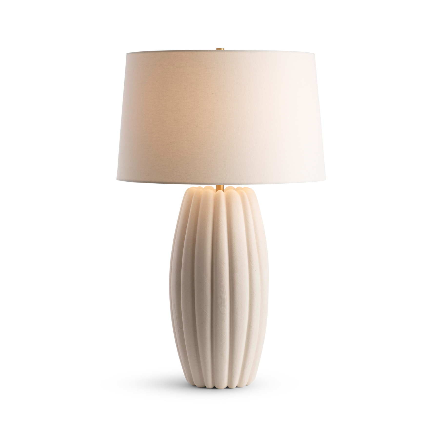 The Bernese Table Lamp features smooth grooves extending along its lightly textured ceramic base, finished in a refined off-white with subtle brush strokes. Its design culminates in delicately scalloped edges, paired with a tapered drum shade in coordinating linen. This lamp offers a sophisticated accent that seamlessly enhances elevated contemporary interiors with understated elegance.
