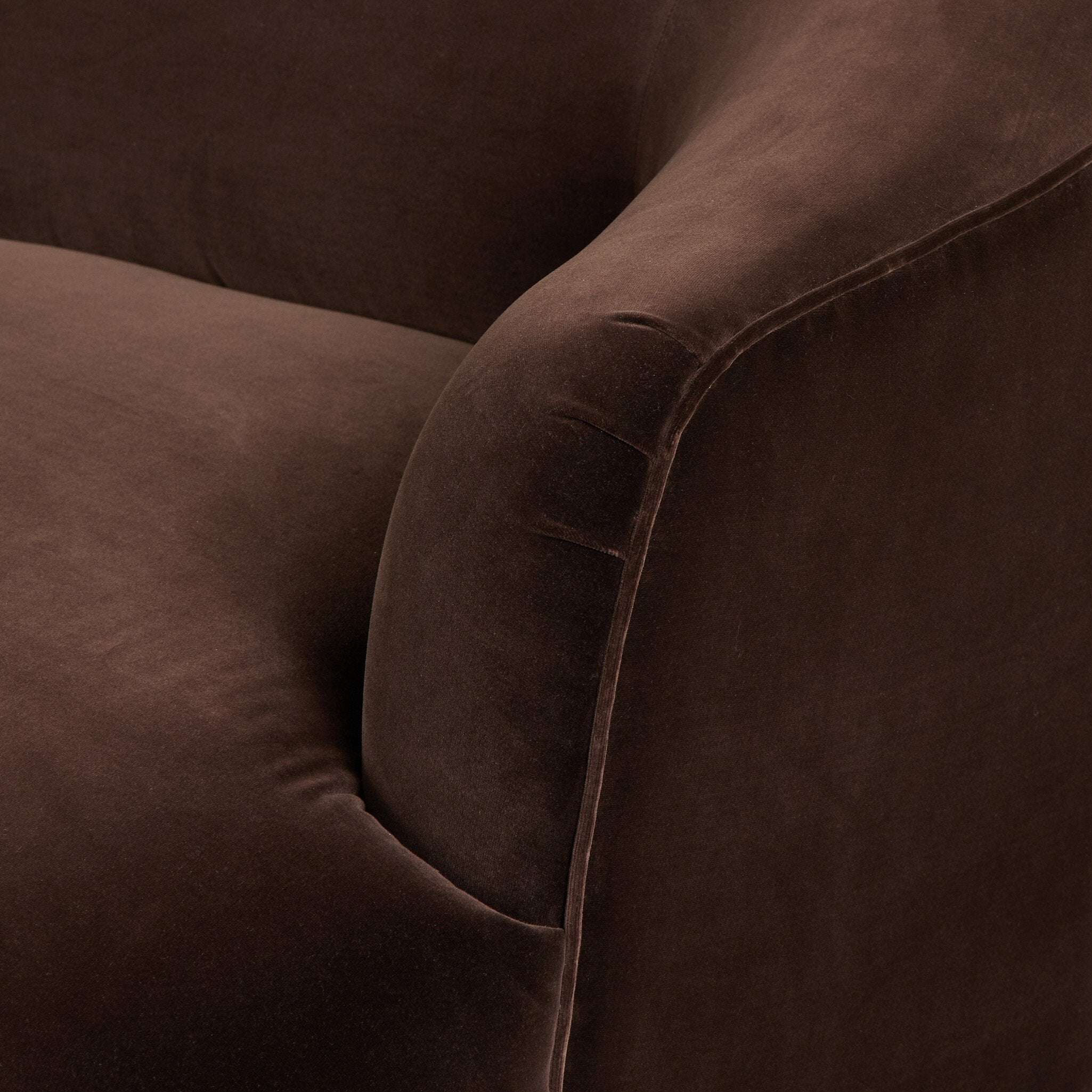 This 85" sofa bridges contemporary and classic aesthetics through thoughtful design. Generous T-cushion seating paired with gracefully curved armrests creates inviting comfort, while the sumptuous cocoa velvet upholstery and refined frame deliver understated elegance to sophisticated living spaces.