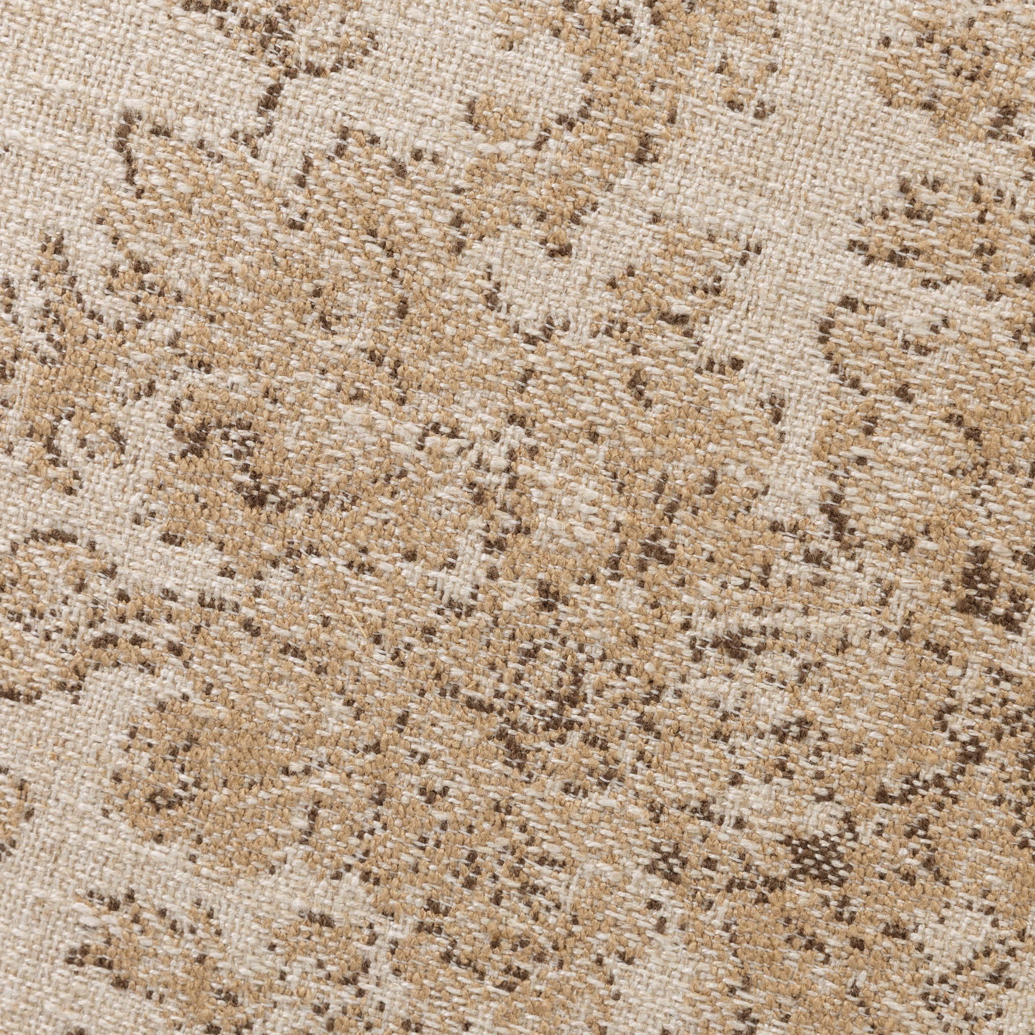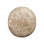 For an extra seat or propped feet, this welcoming ottoman features a subtly tapered shape and a rounded base with bun feet beneath. Crafted from almond-finished oak and upholstered with a linen blend fabric that features a beautiful damask pattern.