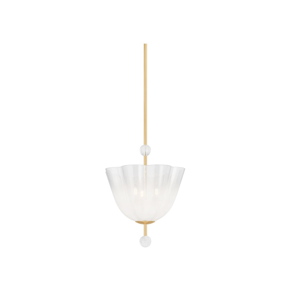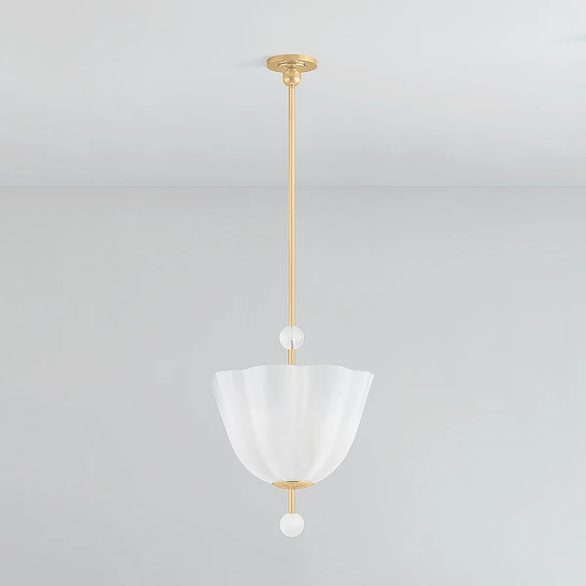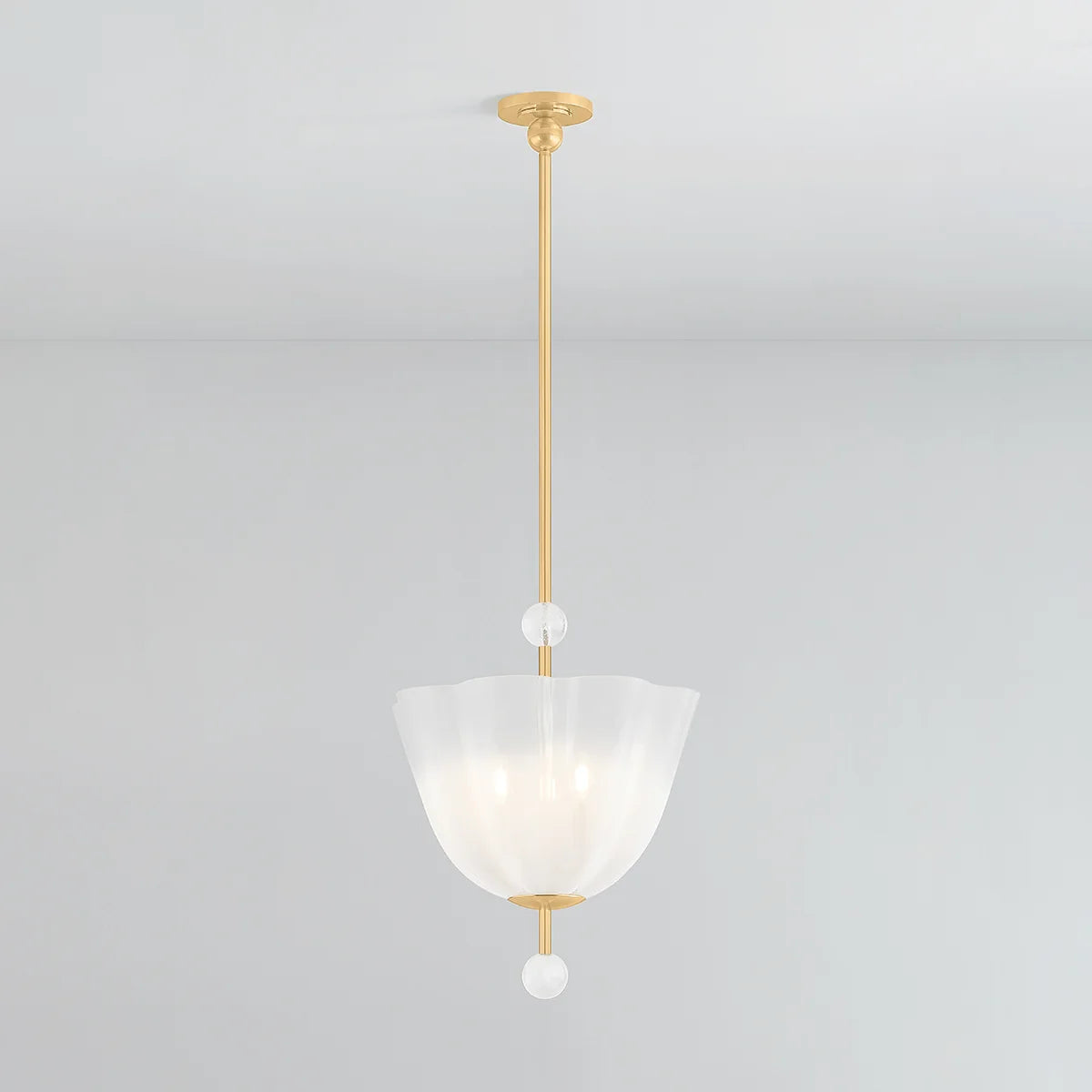 Cambria Heights offers a delicate and light silhouette, introducing natural elegance to your ceiling. Its misty Sfumato glass shade, featuring softly scalloped edges, seems to hover effortlessly in both pendant and lantern designs. Enhancing its artistic appeal, a gem-like rock crystal accent adds a refined touch. The fixture’s Aged Brass central rod ensures a polished and sturdy framework for this graceful lighting piece.