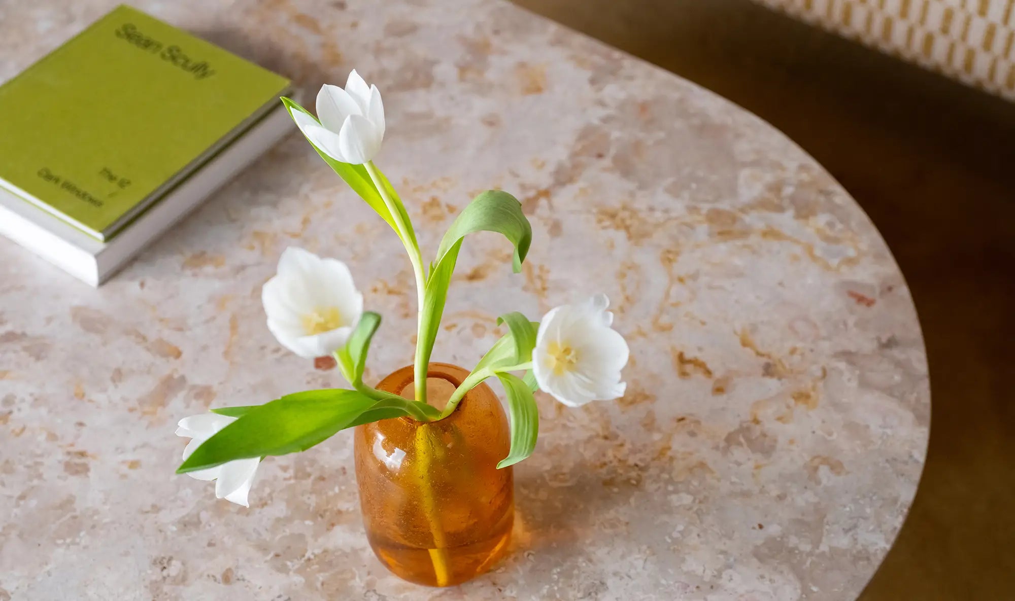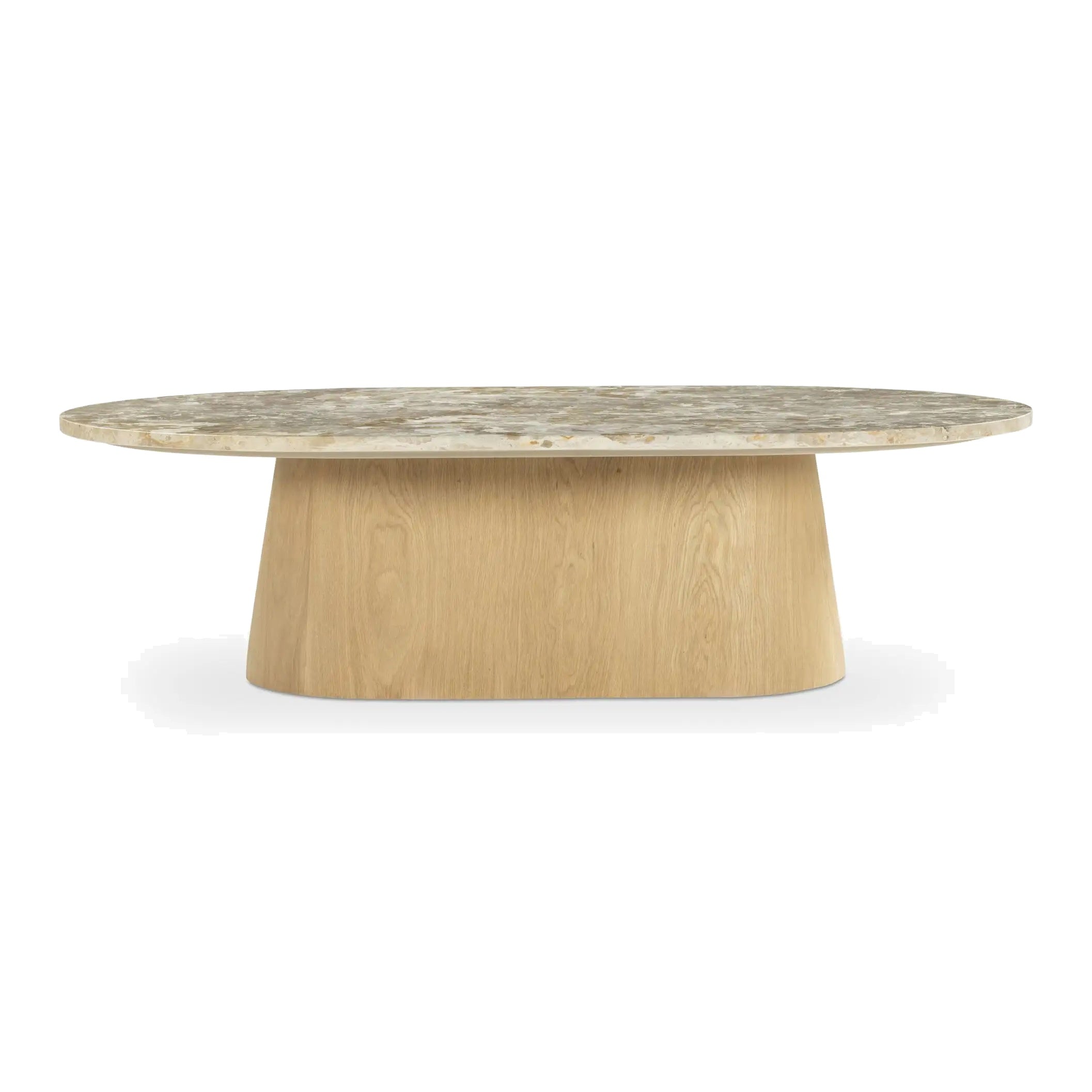 This marble-topped occasional table transforms angular interiors through thoughtful proportions and material dialogue. The stone surface—featuring distinctive natural veining—sits atop a gently tapered oak base whose curved silhouette echoes the tabletop's organic geometry. The warm wood grain complements the marble's subtle patterns, creating visual continuity across the piece. An understated design solution for rooms requiring softened lines and sculptural presence without visual weight.