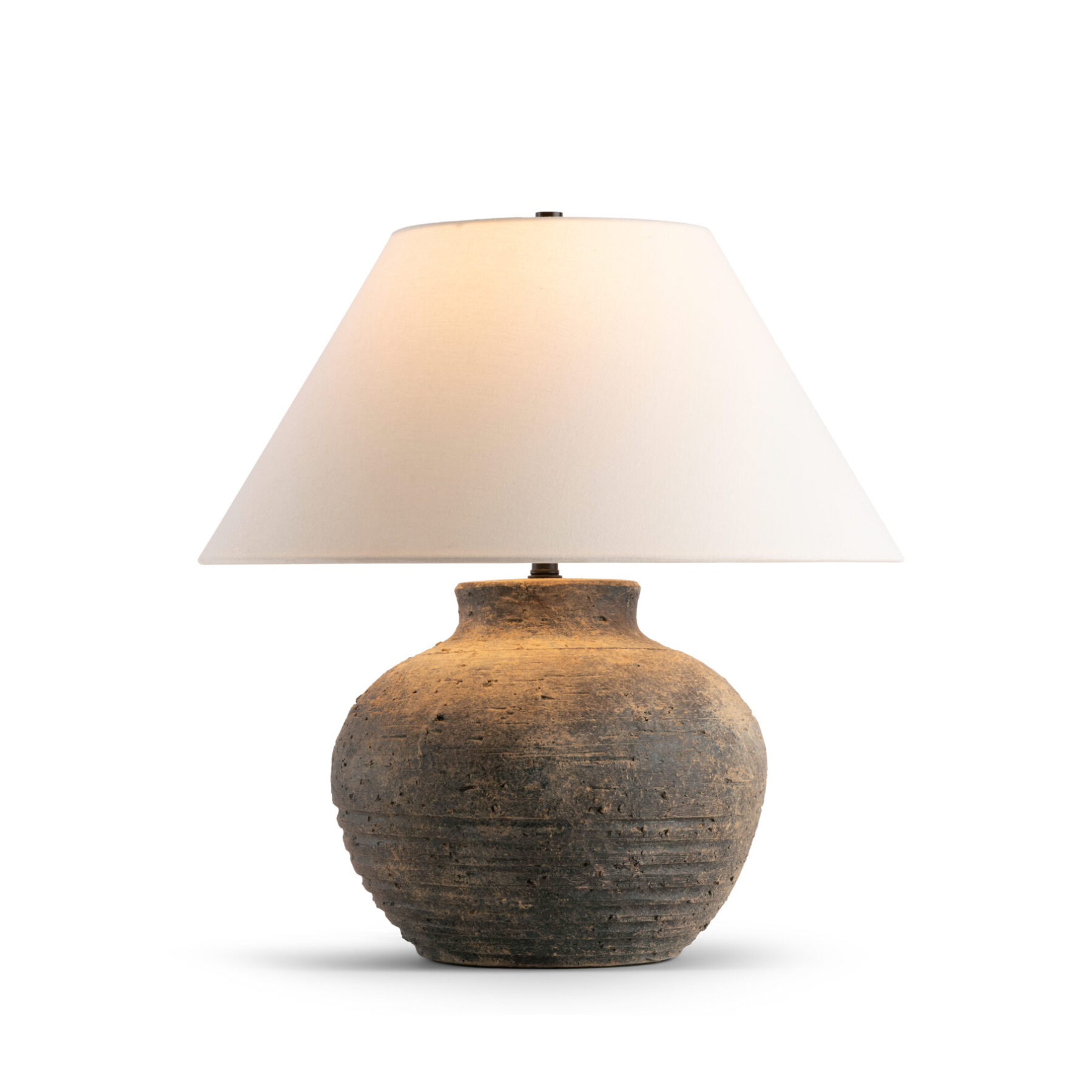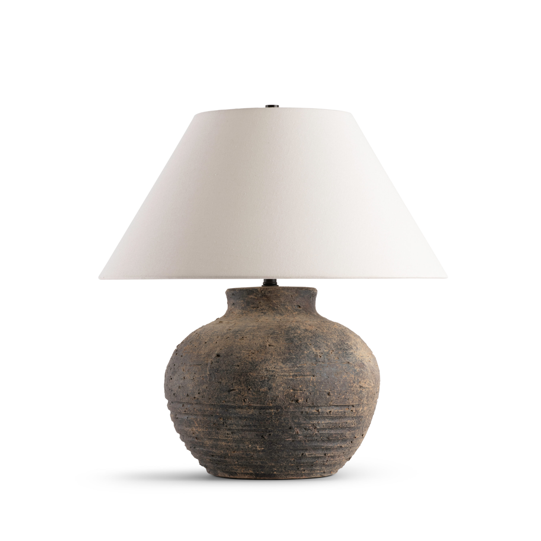 The Cassia Table Lamp combines expert craftsmanship with timeless design, featuring a wide, curvaceous brown ceramic base rich with a deeply weathered texture that adds character through every detail. Topped with a tapered off-white linen shade, it provides a striking contrast that enhances any space. Blending contemporary style with classic appeal, this lamp brings both warmth and sophistication to your decor.
