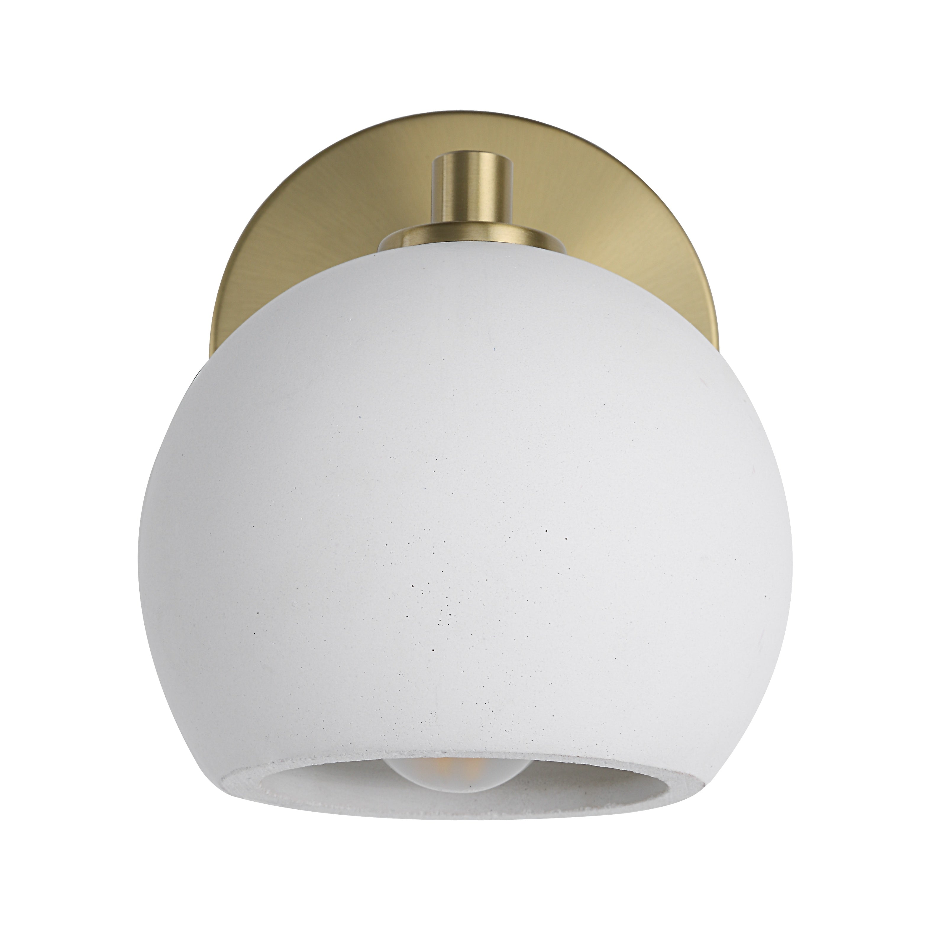 The Cella wall sconce combines modern design with simplicity. It features a white concrete globe shade that provides a soft, even light. Mounted on a burnished brass arm and plate, it offers a stylish, clean look. Hardwired for a seamless installation, this sconce brings both trend and timeless elegance to any space.