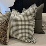 -double sided square ivory ruffle pillow cover featuring fine grid pattern in black