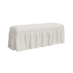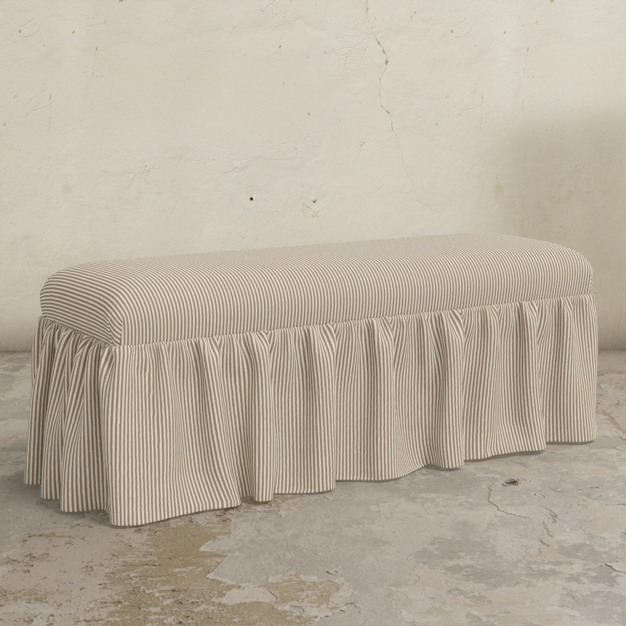 The Cricket Ruffle Bench combines refined aesthetics with versatile functionality. This made-to-order piece features elegant ruffle detailing that adds visual interest to any room. Position it at the foot of your bed, along your dining table, or in your entryway to create a welcoming focal point. Select from our curated custom fabric options to perfectly coordinate with your existing décor and design vision. Each bench is crafted to your specifications, ensuring a tailored fit for your space.