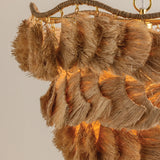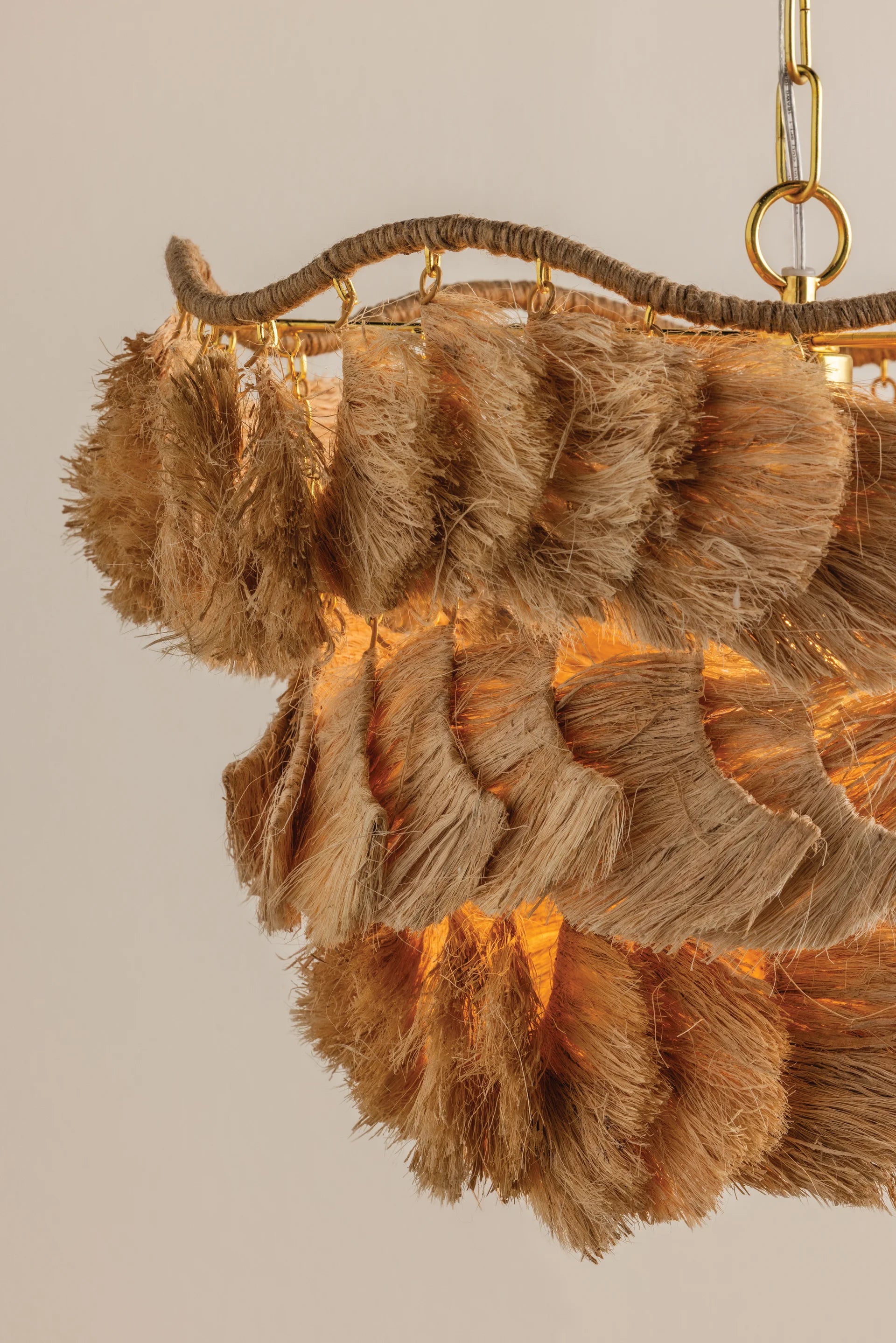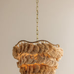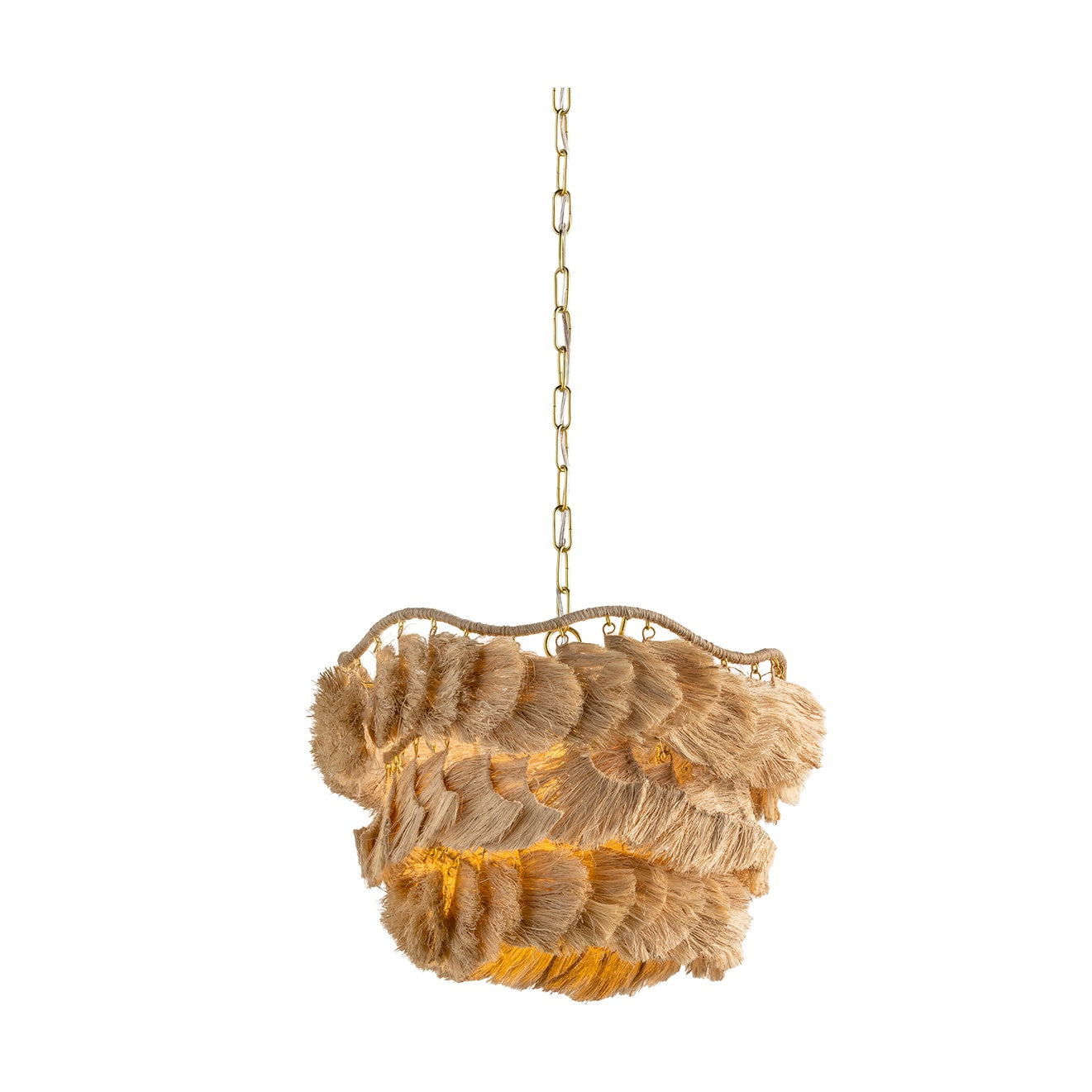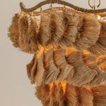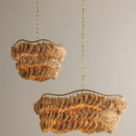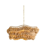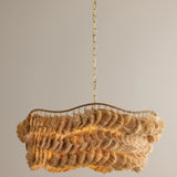 The Daria chandelier makes a strong case for craftsmanship, finding ease in a complex composition. The undulating, wrapped frame is exposed at the top, celebrating the suspension of each separate piece of the shade. Soft, flowing strands of natural raffia form textured, wave-like layers that face different directions to create the shaggy fixture. An Aged Brass finish adds a polished touch to this fiber art-inspired beauty. Daria is available in two sizes.