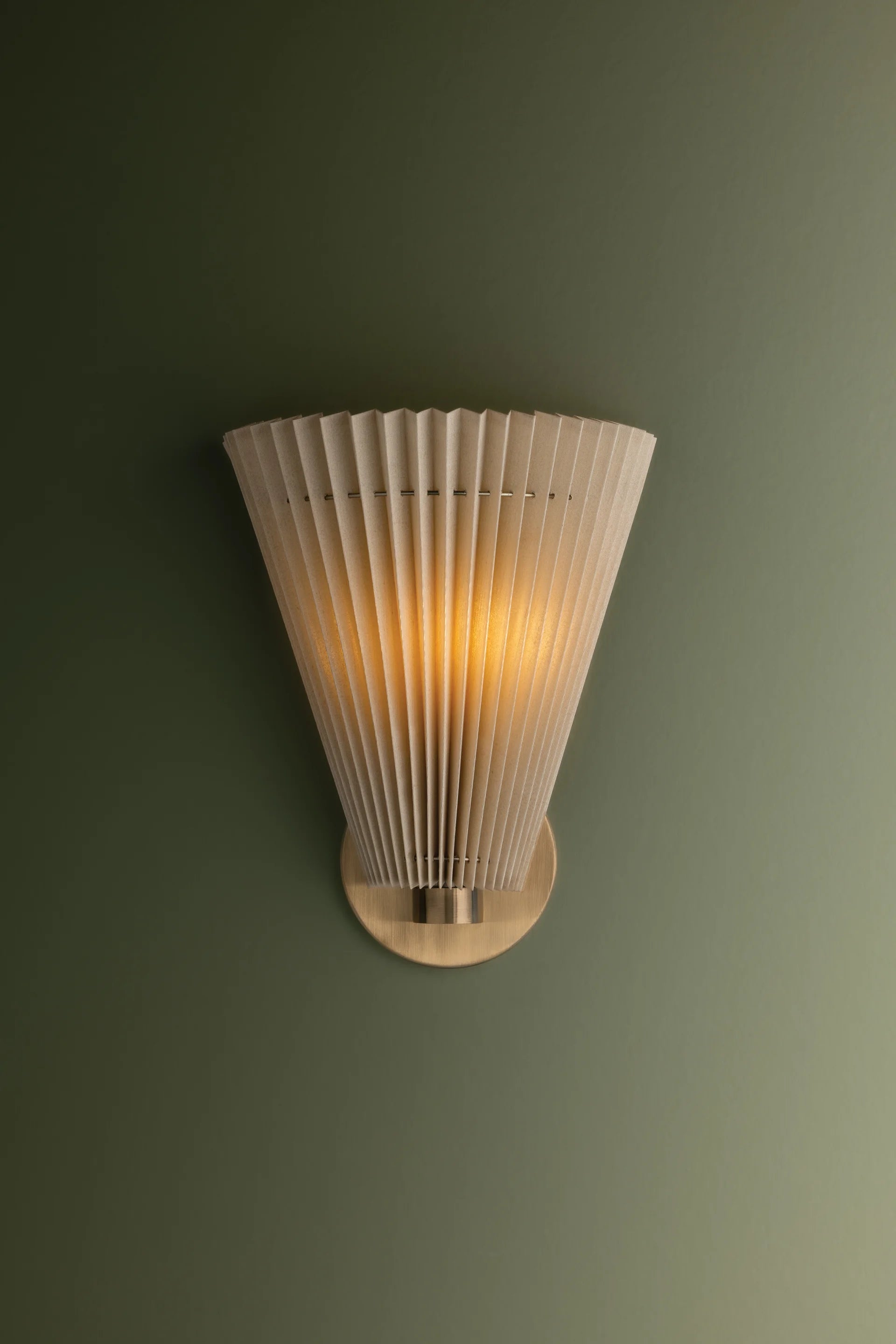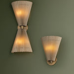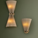 The Dell wall sconce balances softness with architectural form, drawing inspiration from vintage pleats and fan motifs. Offered in single or double light options, its faux silk shades are gently gathered by slender metal rods that pass through them, producing a natural, subtly uneven drape. The Patina Brass hardware enhances the antique character of this refined lighting fixture.