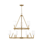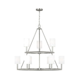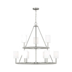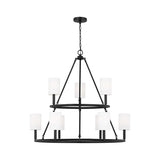 This extra-large chandelier showcases a traditional farmhouse aesthetic combined with crisp, simple lines, perfect for a transitional décor style.