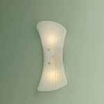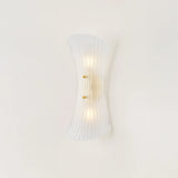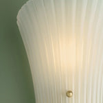 In the vein of mid-century Murano sconces, Esmae’s shell-shaped silhouette is a thing of beauty. The etched clear glass shade features fine-resolution ribbing that runs parallel to the form, curving inwards at the center. Two small spherical thumbscrews provide a glimpse of the Aged Brass hardware while keeping the focus on the translucent glass.