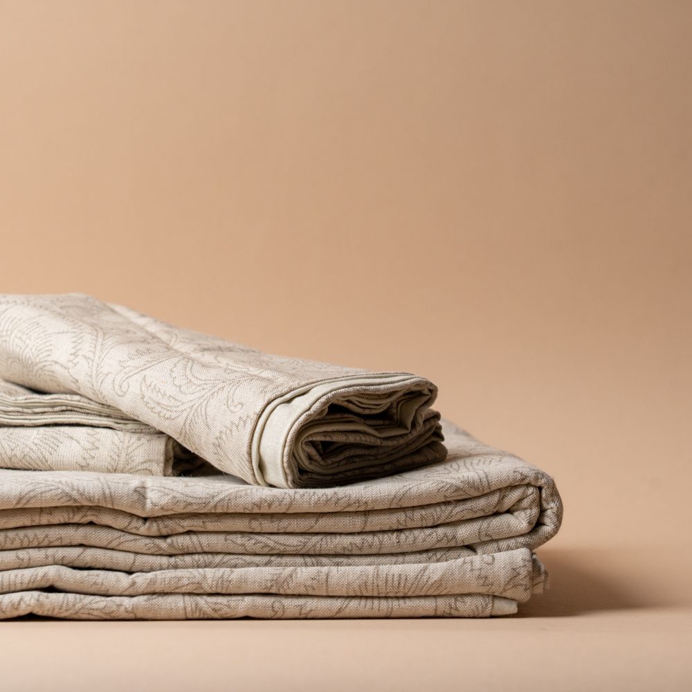 Elevate your bedroom ambiance with the Floral Motif Duvet Cover Set in Natural. Its organic botanical design, inspired by fiddle leaf shapes and spirals, introduces a calm, nature-infused aesthetic. The linen front offers a soft, breathable feel, while the cotton back ensures added comfort and durability. This set combines refined style with practical comfort for a restful retreat.