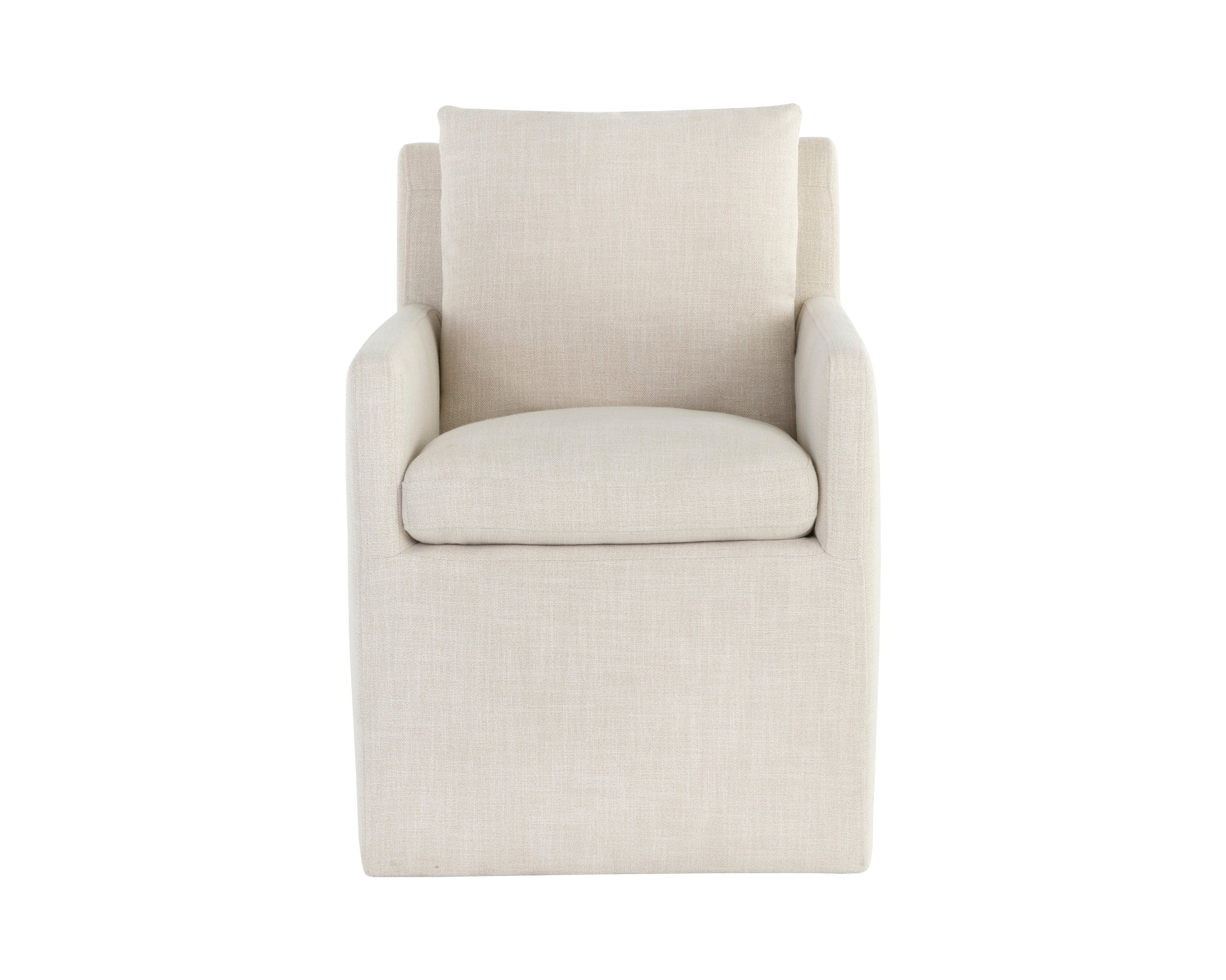 The Glenris Wheeled Dining Armchair combines classic sophistication with comfort. Upholstered in effie linen fabric, it features feather-filled cushions that benefit from regular rotation and fluffing to preserve their comfort and appearance. For detailed maintenance guidance, please refer to our Product Care page.