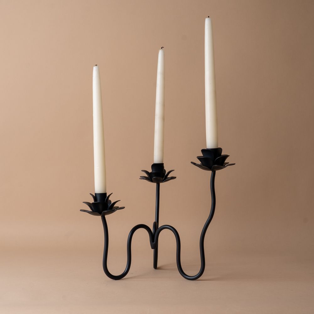This wrought iron candelabra evokes curved stems of ranunculus flowers swaying in a garden. Each winding stem holds a standard taper candle, casting a warm glow wherever it's placed.