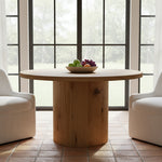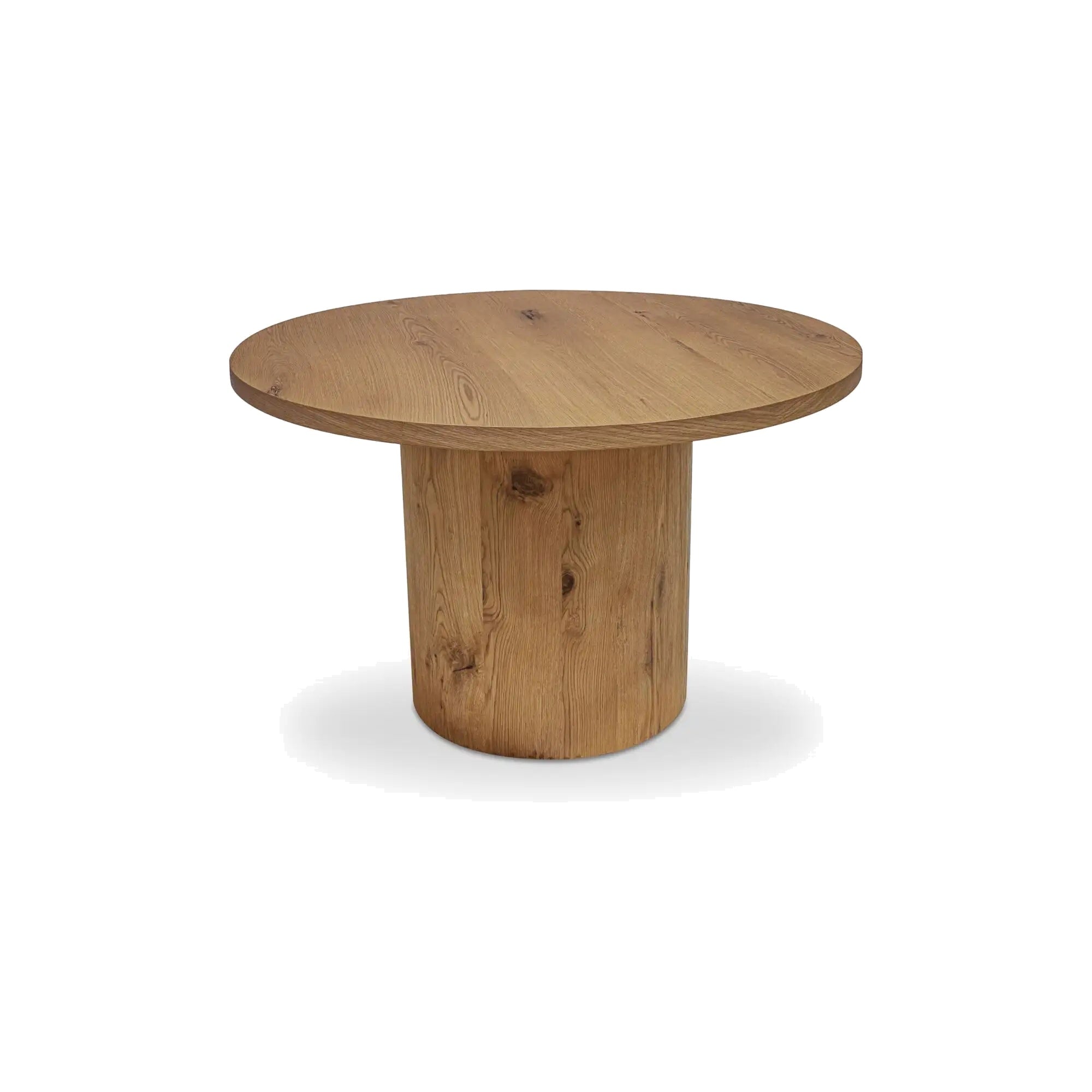 A round dining table with clean, modern design. The sturdy pedestal base supports a spacious top with a distinctive edge detail. Finished in rustic oak for warmth and character, it combines minimalist style with solid construction and timeless appeal.