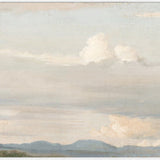 This historical landscape painting showcases a mesmerizing sky where white clouds, kissed by the warm sunlight, drift across a serene blue backdrop.