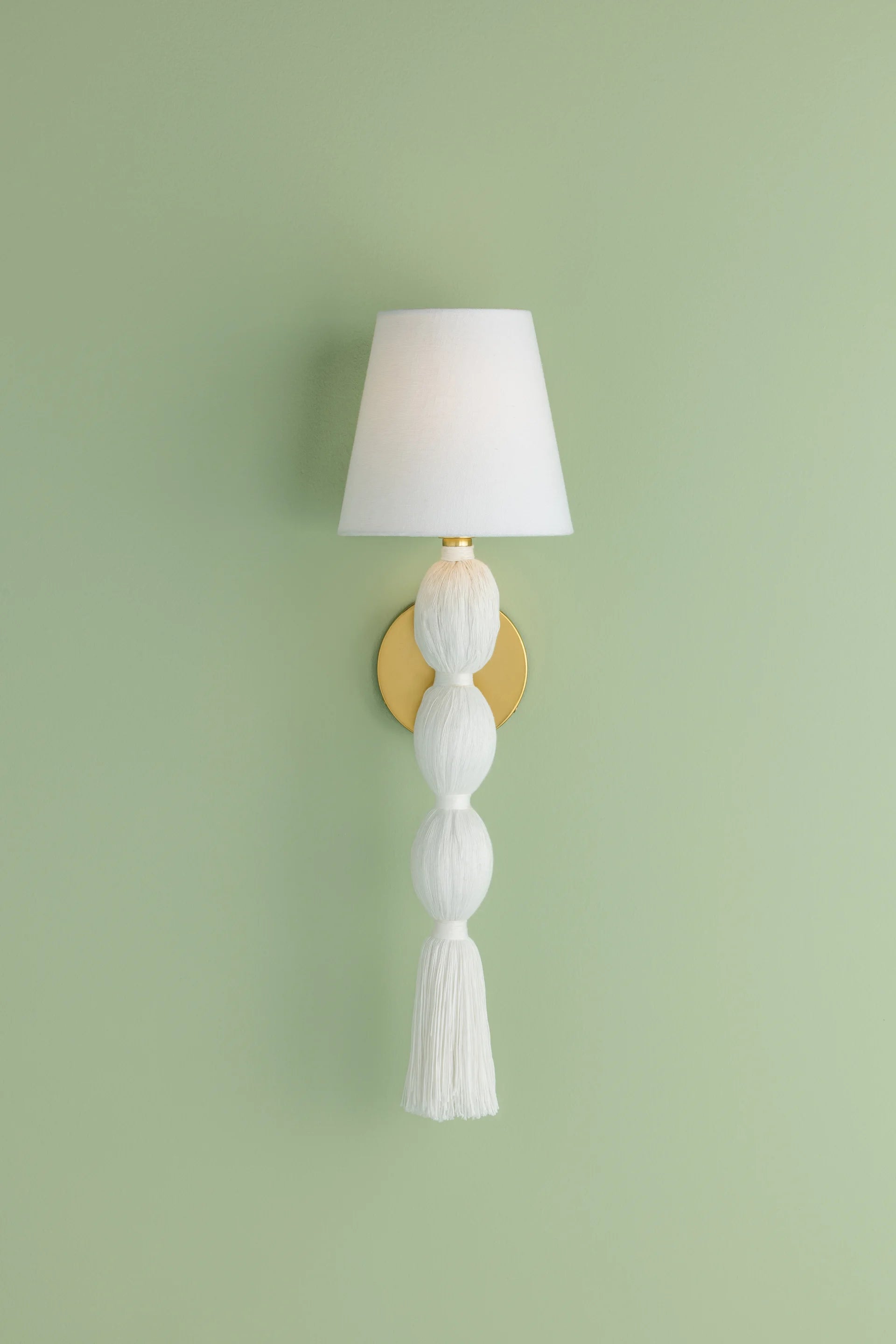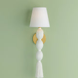 A celebration of authentic handicraft, the cinched silhouette of Indra resembles an elongated tassel. The cotton string and white linen shade create an all-over light, fresh appearance, accented by Aged Brass hardware at the neck. This single-light sconce serves as an artistic piece for small spaces in need of a spruce.