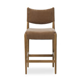 A fresh take on midcentury styling, perfectly sized for the counter. Supportive back and seat cushions are upholstered in a soft, neutral fabric and framed out by toasted solid oak.