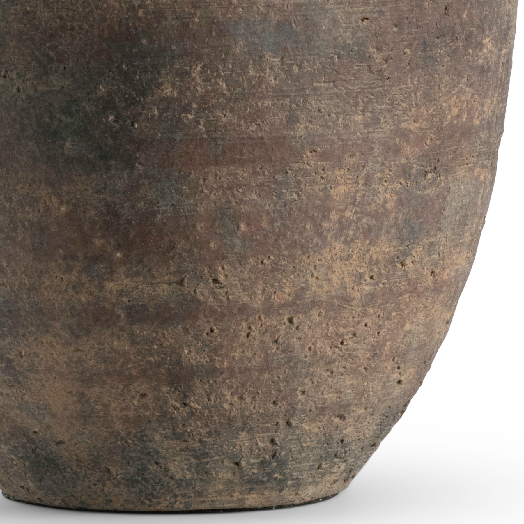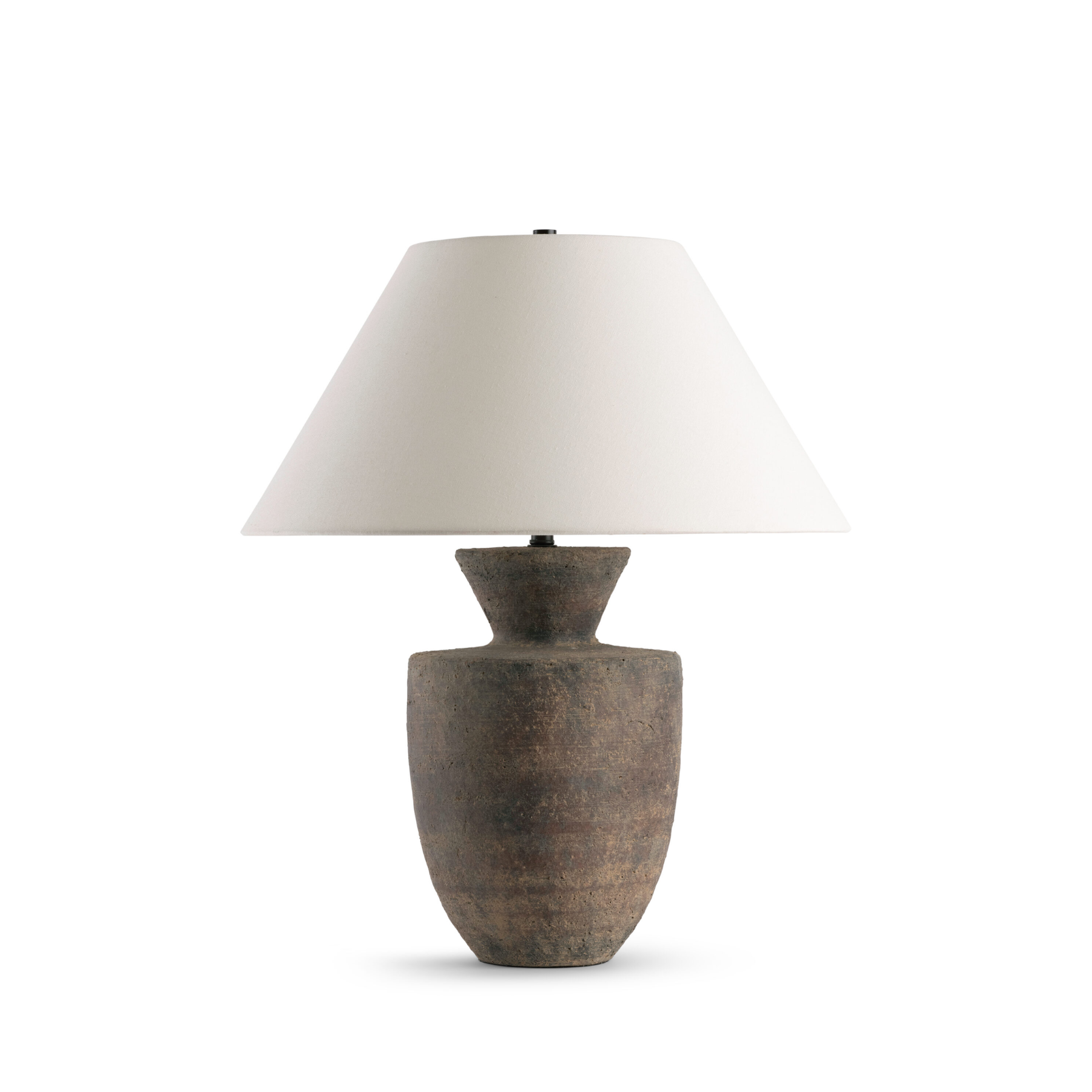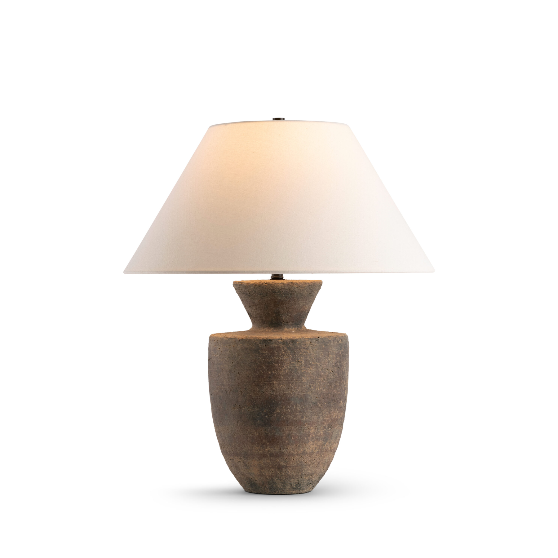 The Joseph Table Lamp blends artisanal craftsmanship with timeless design. Its dense ceramic body, finished in warm brown with textured pits and grooves, evokes a sense of heritage and depth. The lamp’s elegant upward curve culminates in a flared collar that harmonizes with the sharply tapered drum shade, creating a balanced, sculptural silhouette. With versatile dimensions, this lamp adapts seamlessly to various spaces, offering both functional lighting and an expert touch of sophistication.