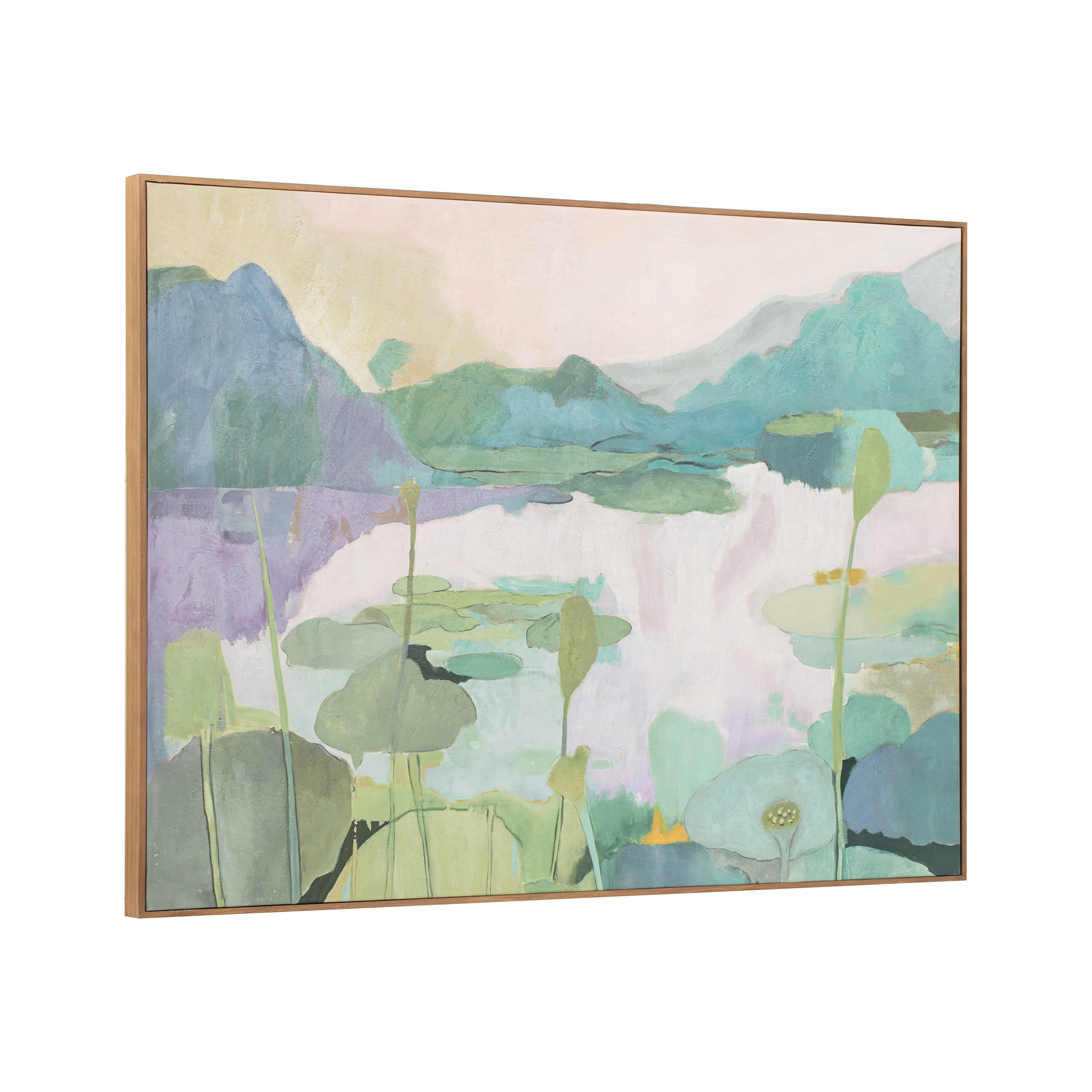 The Lilypads framed canvas portrays a tranquil scene, inviting calm and contemplation within any room. Delicate pastel shades illustrate ethereal lilypads and water lilies against an abstract background. Created with acrylic on canvas and enclosed in a solid pine frame, this piece elegantly merges modern aesthetics with classic themes.