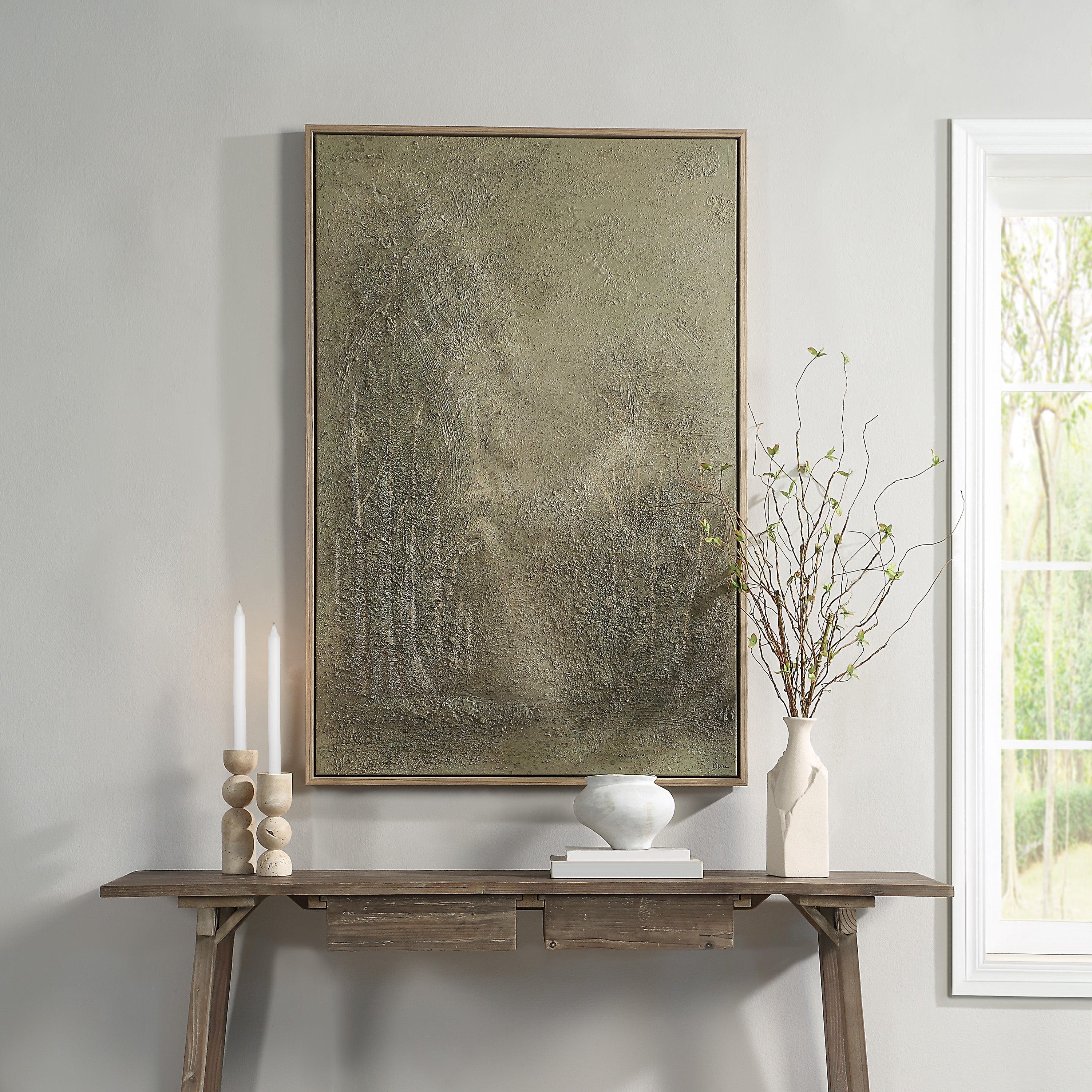 Capture a relaxed atmosphere in any evolving space with this classic landscape artwork. Featuring hand-painted textured details and subdued hues, this canvas is set within a walnut veneer frame and offers substantial size, perfect for enhancing expansive rooms.