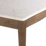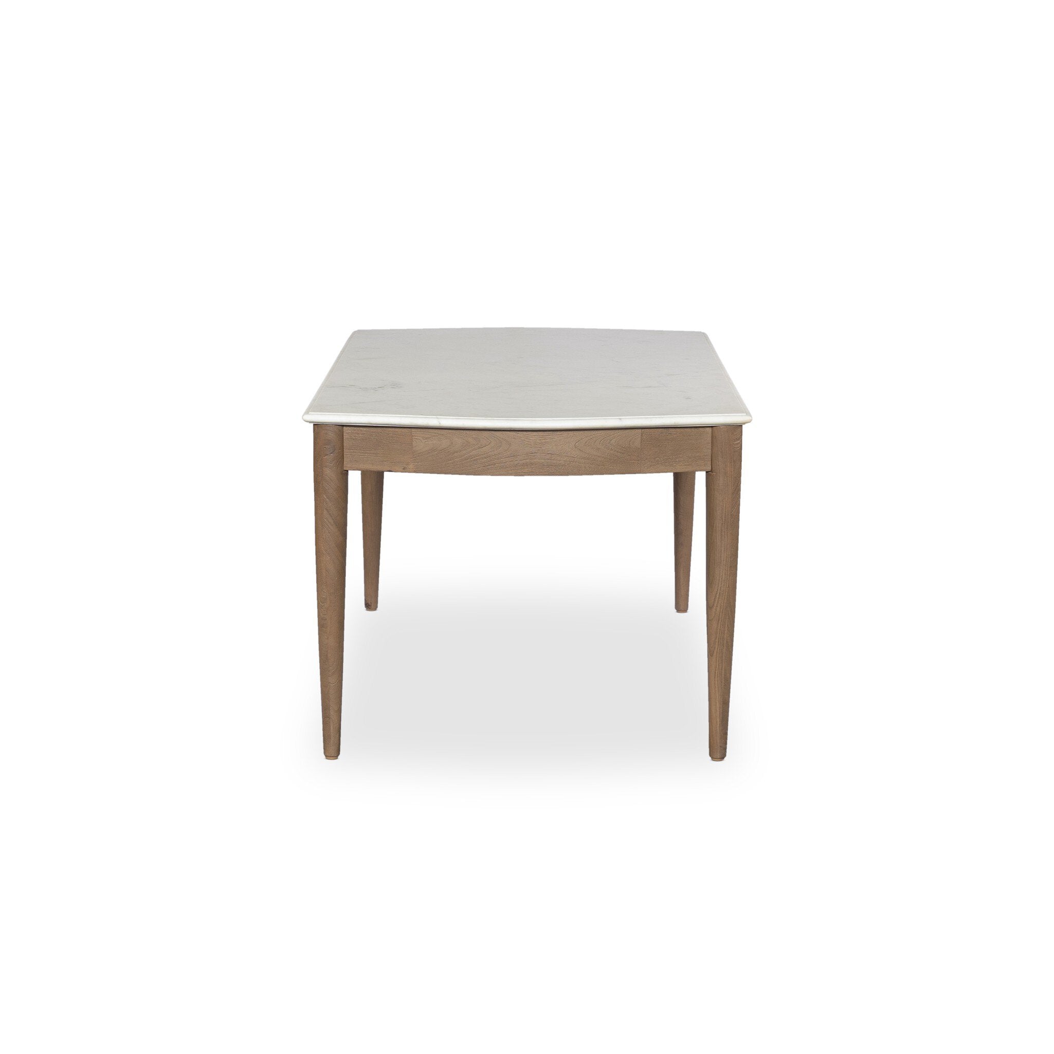 Elevate your dining space with this architectural statement piece featuring a striking white marble top adorned with reverse ogee detailing. Constructed from sustainably sourced mango wood with refined tapered legs, the table's compact proportions make it ideal for intimate gatherings without compromising on design sophistication. A harmonious blend of natural materials and geometric elegance.
