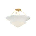 The Loburn Semi Flush draws from Art Deco influences, featuring a scalloped shade that serves as a calm centerpiece. Crafted from a single piece of opal glossy glass, the shade is expertly shaped to mimic two outward-fanning tiers resembling feathers. Supported by a sleek Aged Brass frame, this elegant and luminous fixture appears to effortlessly hover above.