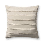 The beige Landry throw pillow from Magnolia Home by Joanna Gaines x Loloi features raised stripes for traditional, farmhouse, or cottage home decor. The pillow cover is hand-woven of cotton and wool in India and measures 22” x 22”, a versatile size for living rooms and bedrooms.
