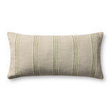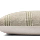 The Lincoln throw pillow from Magnolia Home by Joanna Gaines x Loloi features soft green stripes against a natural beige background with stitched details, reminiscent of vintage farmhouse textiles. The pillow cover is hand-woven of 100% cotton in India and measures 12” x 27”, a versatile size for living rooms and bedrooms of all home decor styles.