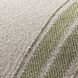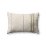 The Selena throw pillow from Magnolia Home by Joanna Gaines x Loloi features light green stripes against a natural beige background, reminiscent of vintage flour sacks. The pillow cover is hand-woven of 100% cotton in India and measures 13” x 21”, a versatile size for living rooms and bedrooms of all home decor styles.