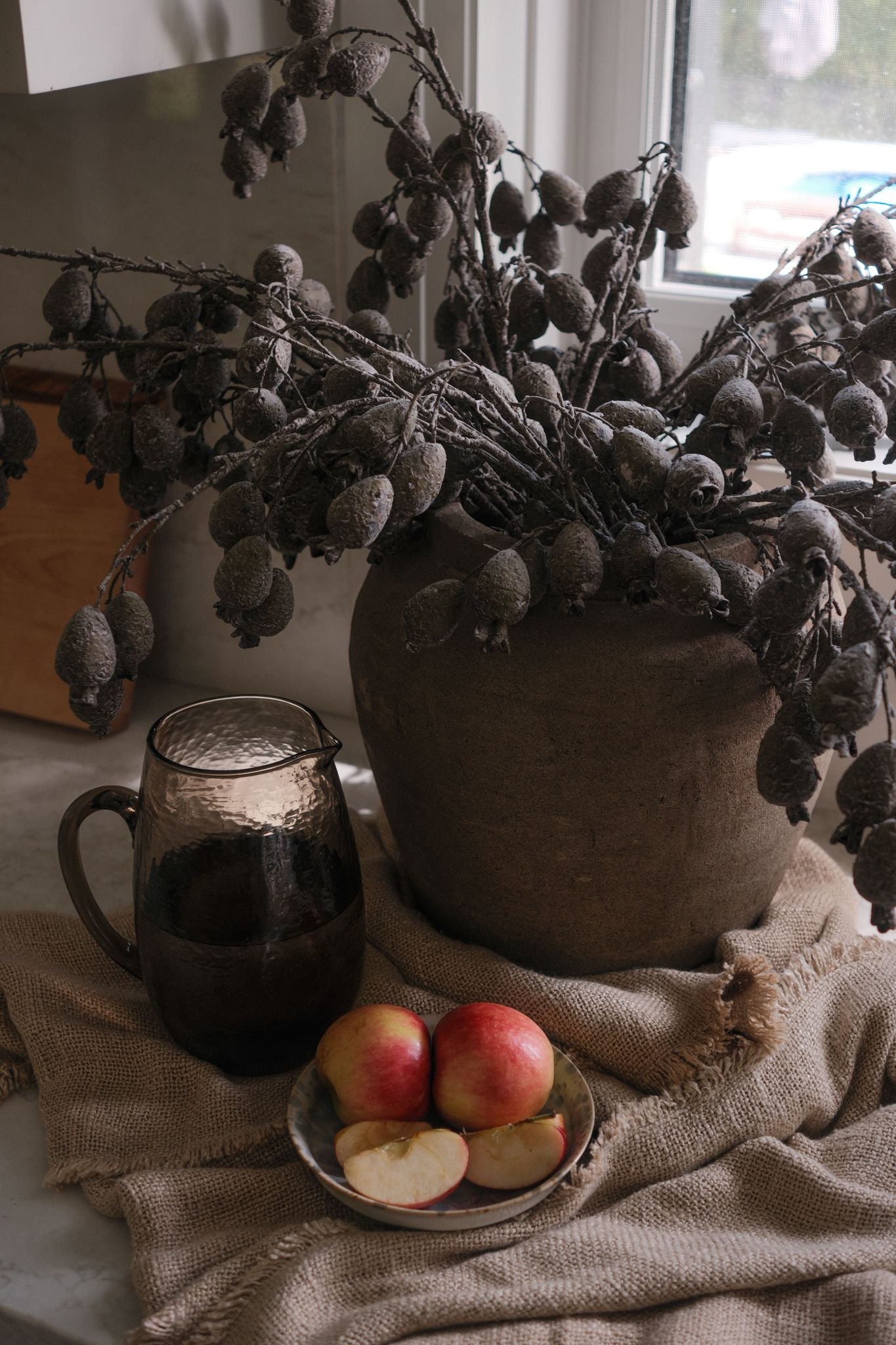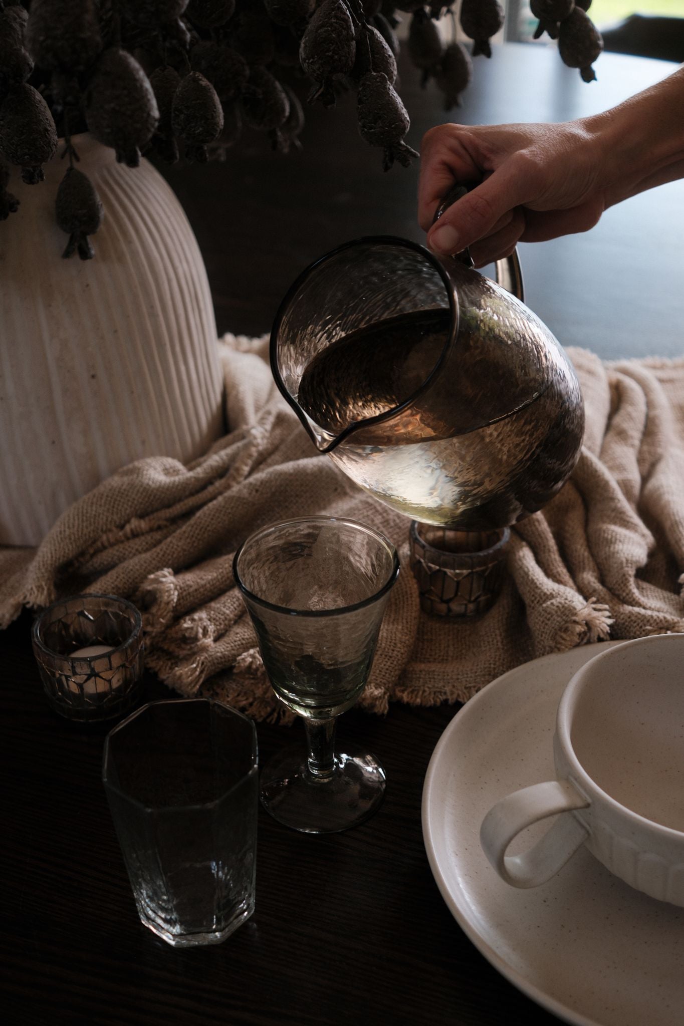 Elevate your dining experience with the Mara Earthen Glass Pitcher, expertly crafted from recycled glass. Its warm, earthy brown tone adds a natural elegance to any kitchen or table setting. Ideal for serving water or cocktails, this hand-blown pitcher also serves as a striking centerpiece, bringing both height and subtle visual interest to your space.