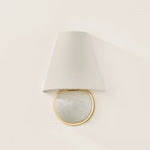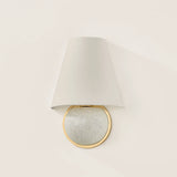 A celebration of geometric forms, the Marlena sconce is playful in both scale and silhouette. Finished in Aged Brass, a racetrack arm loops below the white linen shade, creating a cradle for a speckled ceramic ball. This clever mix of materials and shapes results in a graphic appearance that makes Marlena a standout fixture on any wall.