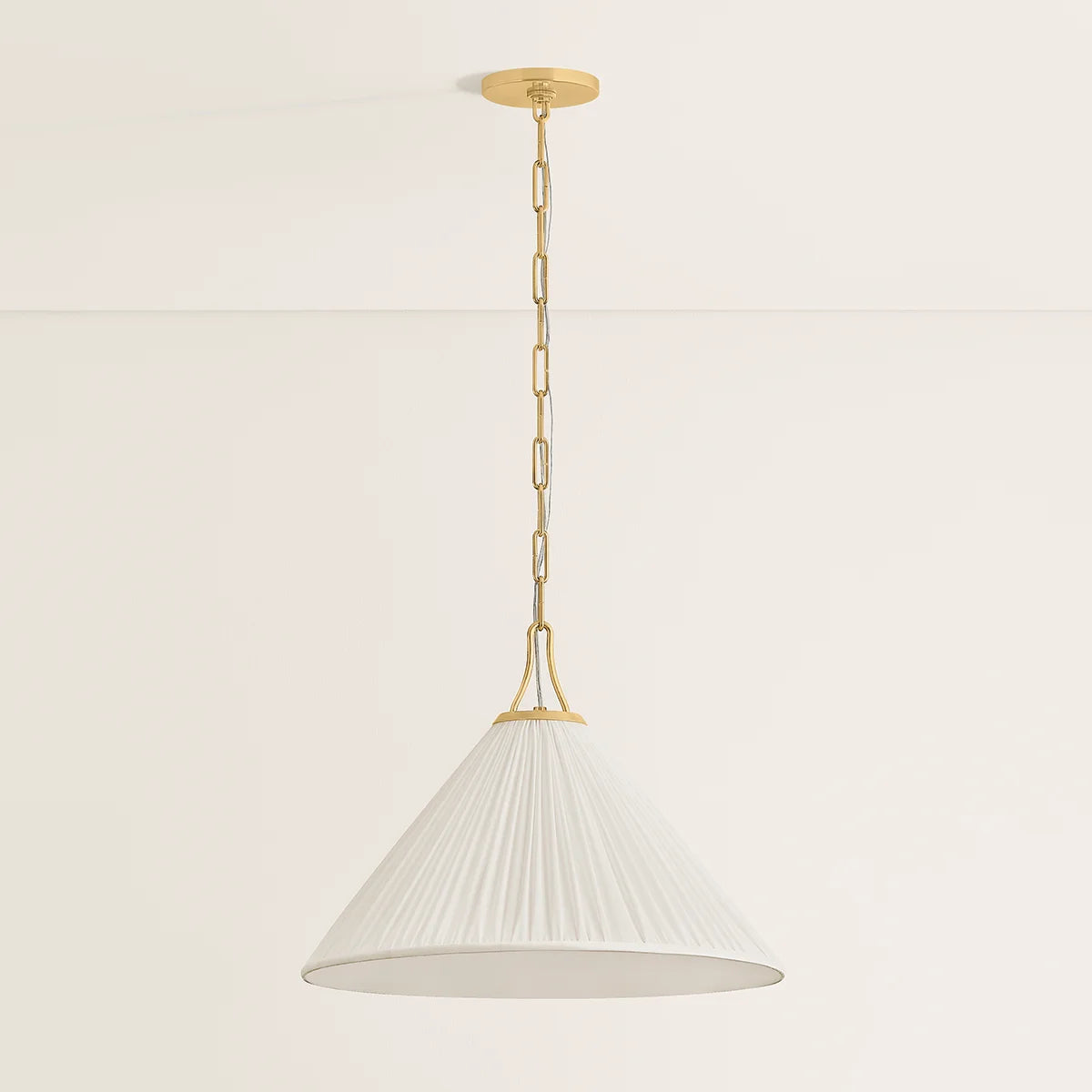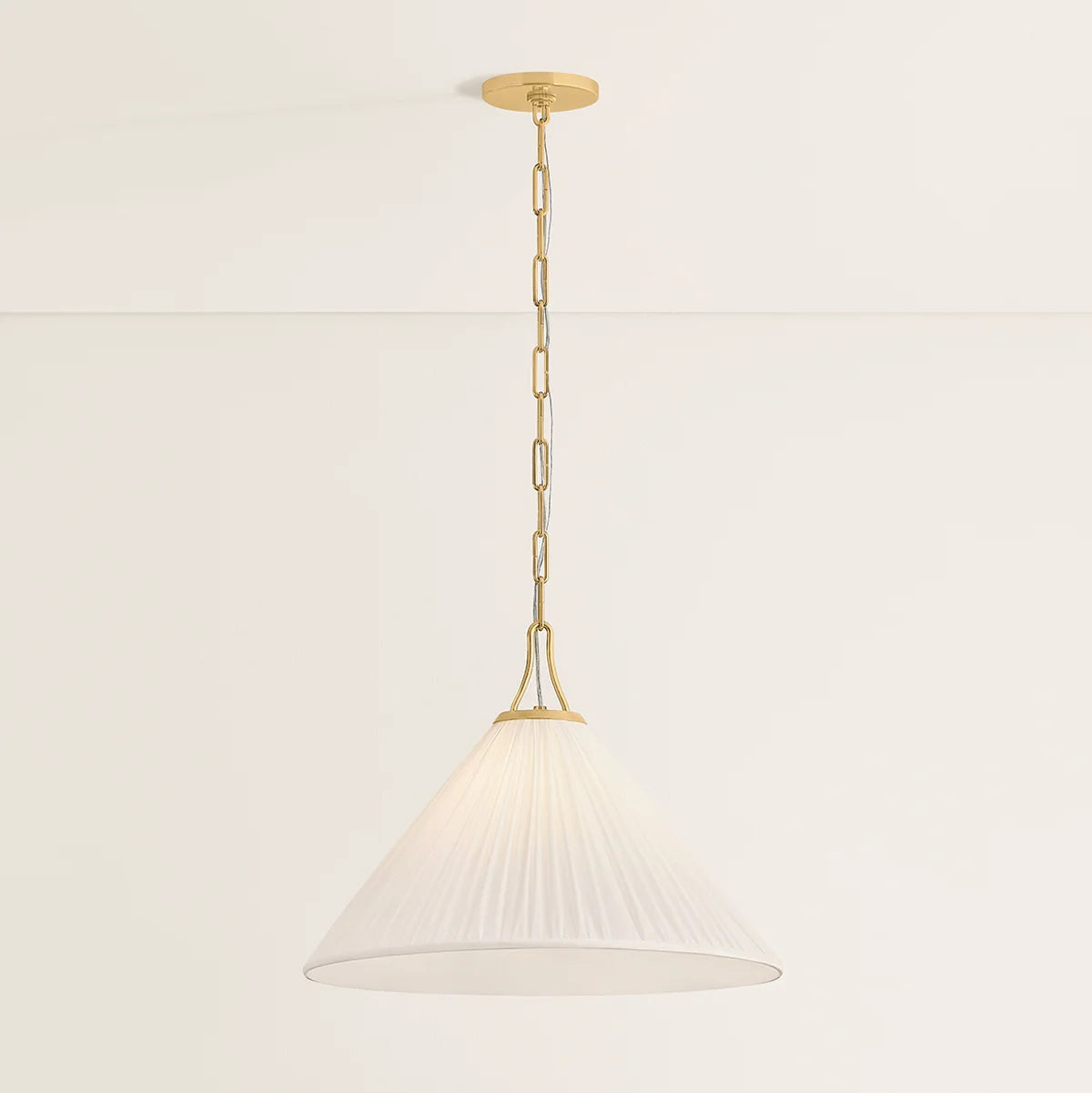Elegant in its simplicity, the Merida pendant pairs a pleated faux silk shade with crisp metalwork. A sleek racetrack loop extends from the top of the fixture, its elongated shape seeming to be drawn downward by the weight of the shade. Finished in Aged Brass, this special detail and classic chain add a clean modern touch to the design. Available in two sizes.
