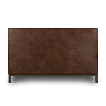 Subtle, modern elegance. A low, tufted headboard in a vintage tobacco faux leather pairs with a simple gunmetal iron base..