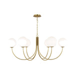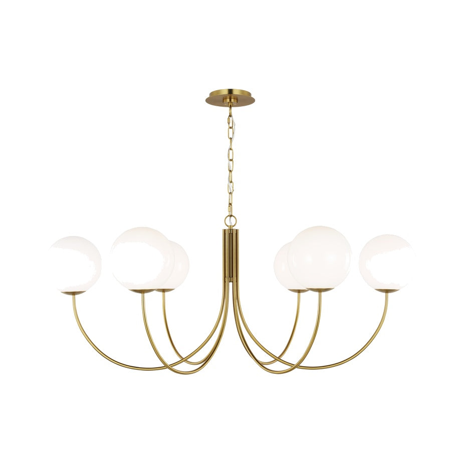 The Noemie Extra Large Chandelier by kate spade new york features six milk glass orbs on curved burnished brass arms. Its mid-century style and modern size provide warm, inviting light, ideal for large spaces like dining rooms, foyers, or living areas. Damp-rated for flexible use, it blends classic design with contemporary elegance.