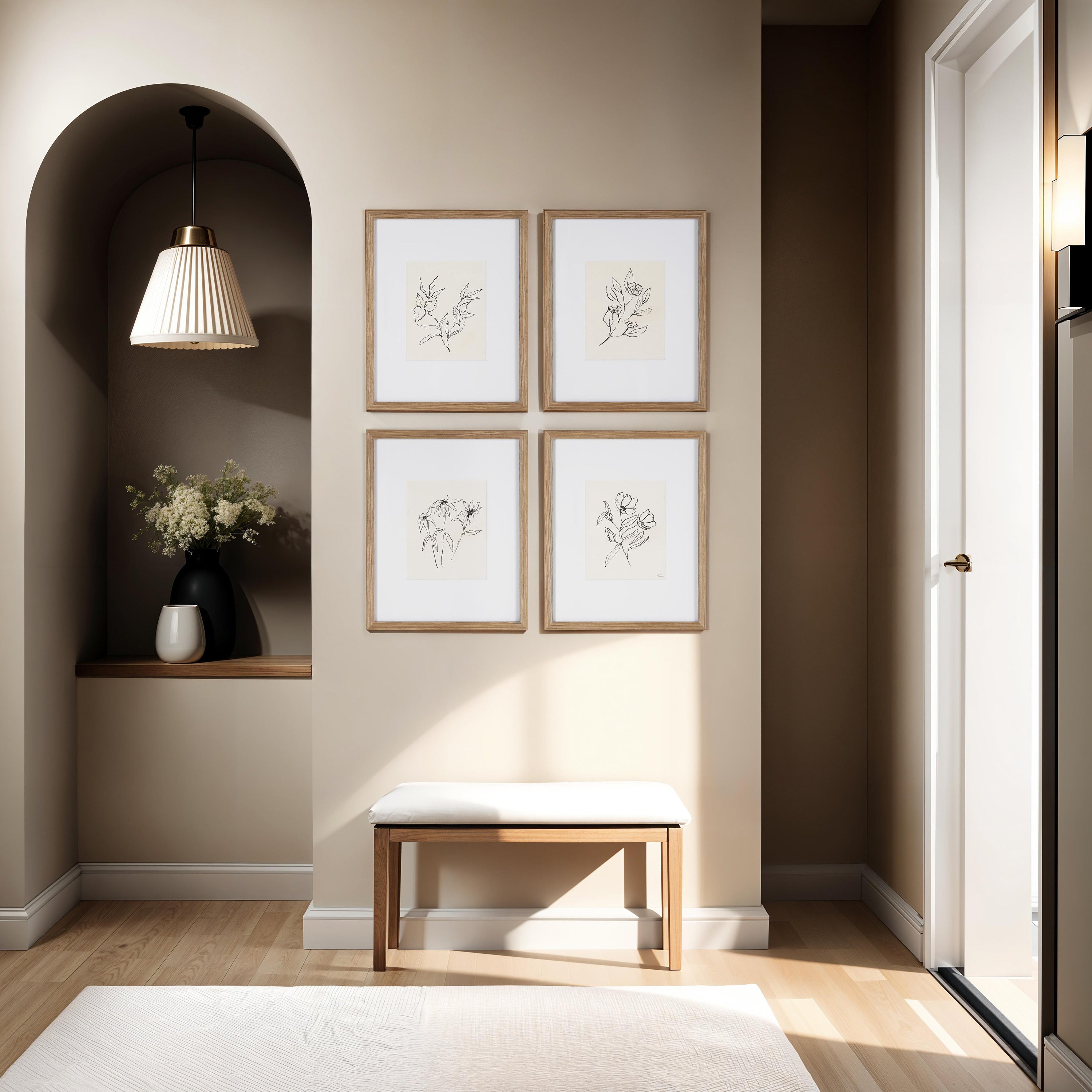 This set of four botanical wall art pieces offers a contemporary twist on traditional design. Each print is presented within a medium walnut veneer frame and accented by a wide mat that emphasizes the elegant, minimalist line drawings. Ideal for arranging in a grid or a linear formation, these artworks bring a timeless sophistication to any space with their understated, neutral palette.