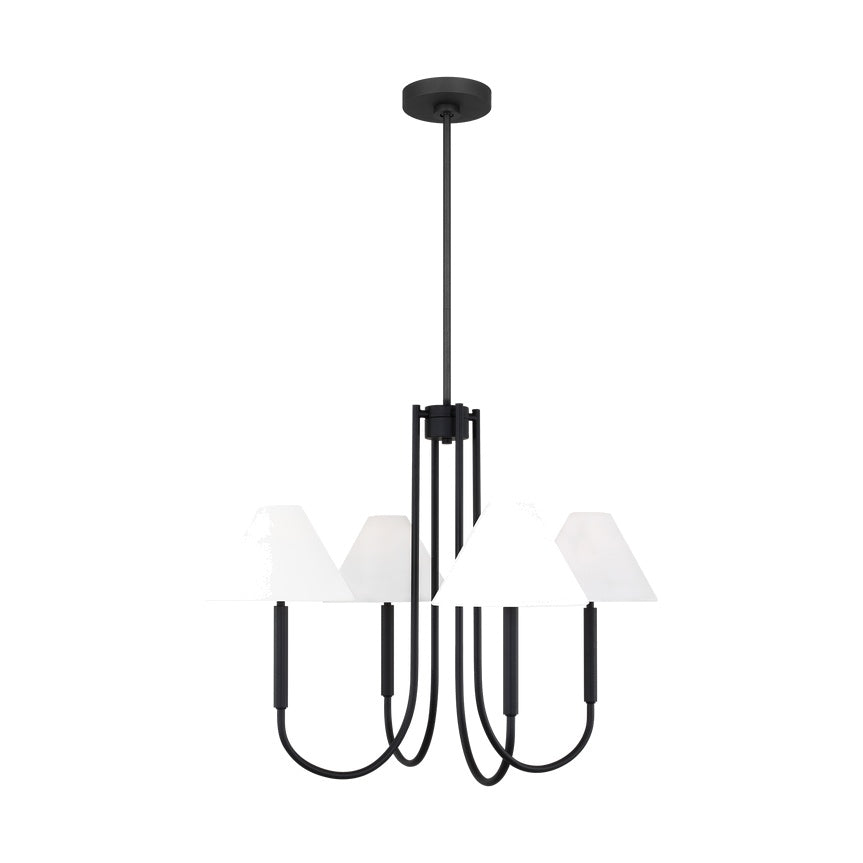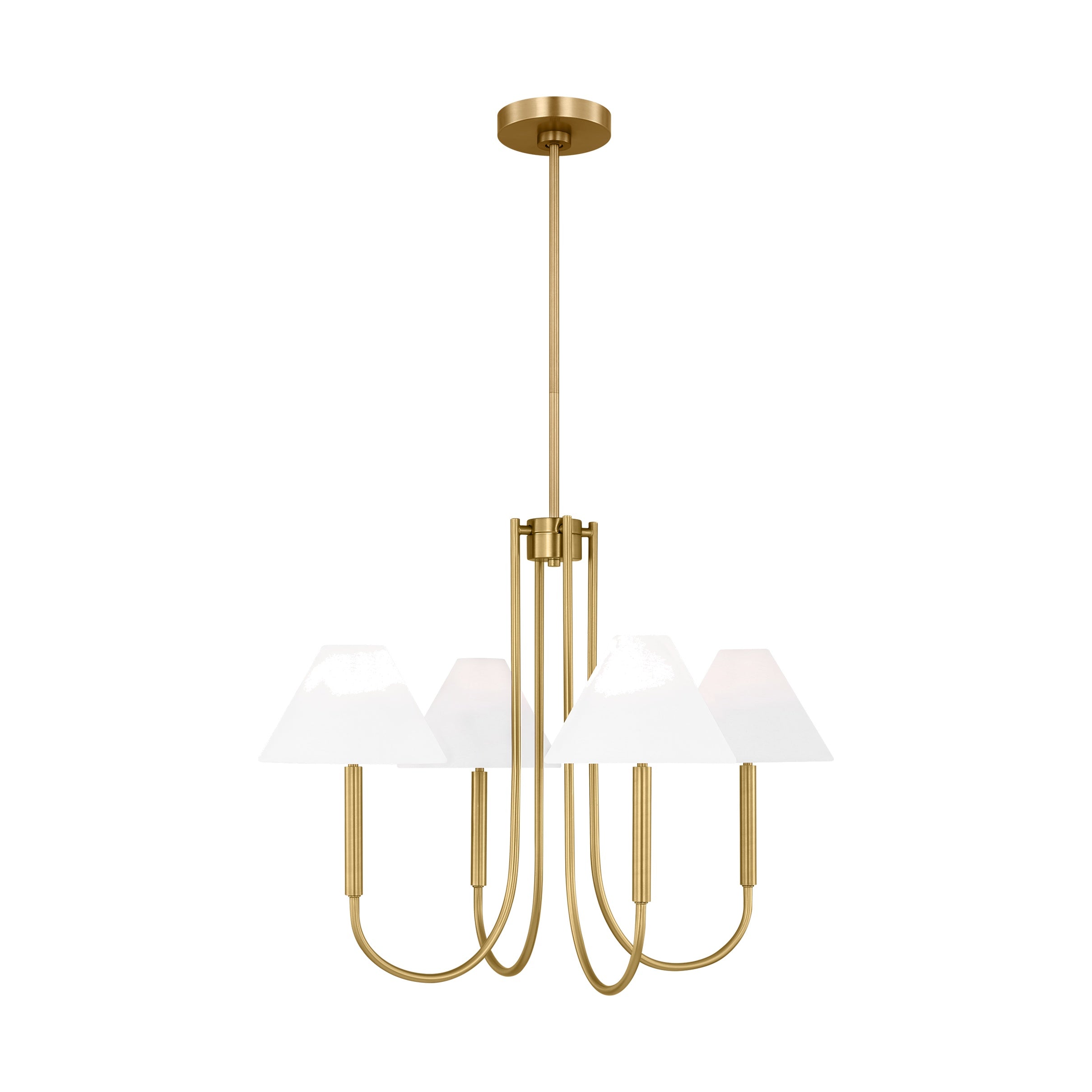 This updated J-arm style chandelier collection harmoniously combines modern and traditional design, featuring extended candle tubes and classic empire shades.