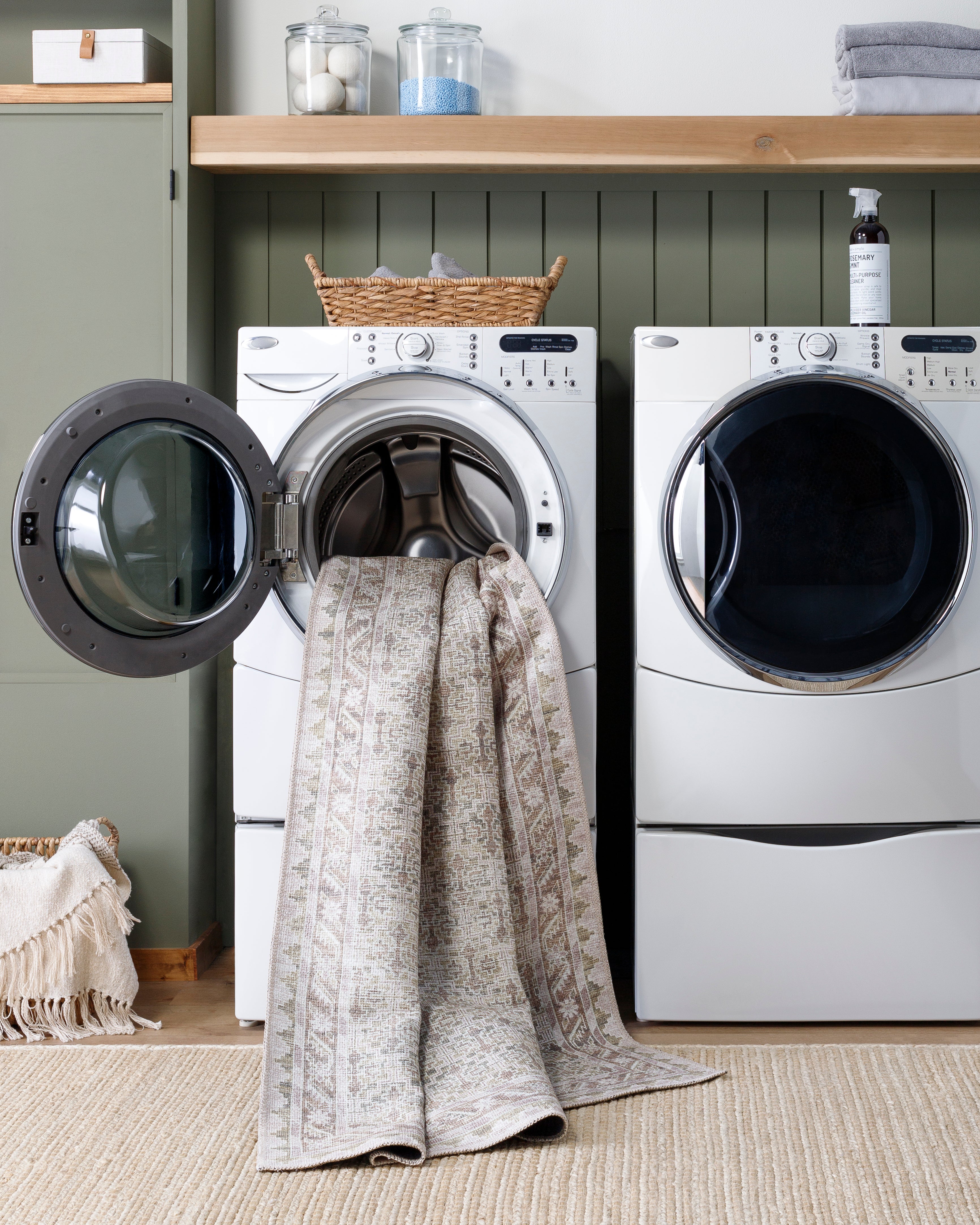 The Rainier Collection designed by Jordyn Smith from PNW Home features durable, machine-washable rugs with a muted color palette and vintage-inspired patterns. These rugs combine practicality with nostalgic charm, making them a versatile choice for any interior.