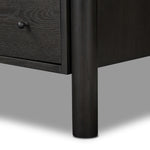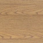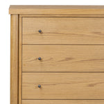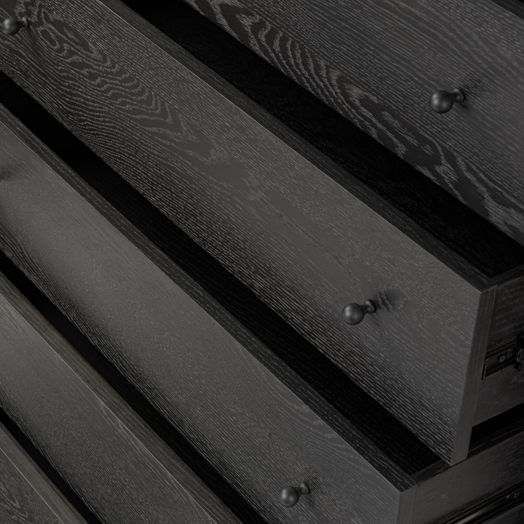 Create storage space in the bedroom with a five-drawer dresser of amber-finished oak. Chunky dowel legs support a tall silhouette and overhang top, all finished out with simple gunmetal hardware.