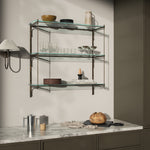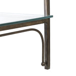 Inspired by vintage ball and rod hardware, this streamlined wall shelf design features delicately curved metal details and simple glass shelves. Finished in a rustic brushed iron with a subtle patina.
