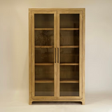 The Rue Glass Cabinet features reclaimed wood with a natural finish and tall glass doors for displaying items. Its simple design includes ample shelving, making it versatile for dining rooms, living areas, or as a linen cabinet. This piece highlights the wood’s unique grain and adds subtle warmth to any space.