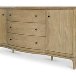 Enhance the ambience of your room with the Sibbie 3-Drawer, 2-Door Console, which combines modern style with traditional appeal through its wire-brushed oak finish and elegant curves. The subtle top overhang and curved edges create a soothing visual continuity, while the three spacious drawers and two panelled doors offer generous storage space. Finishing off the design are dainty metal knobs, lending a touch of sophistication to this enduring furniture.