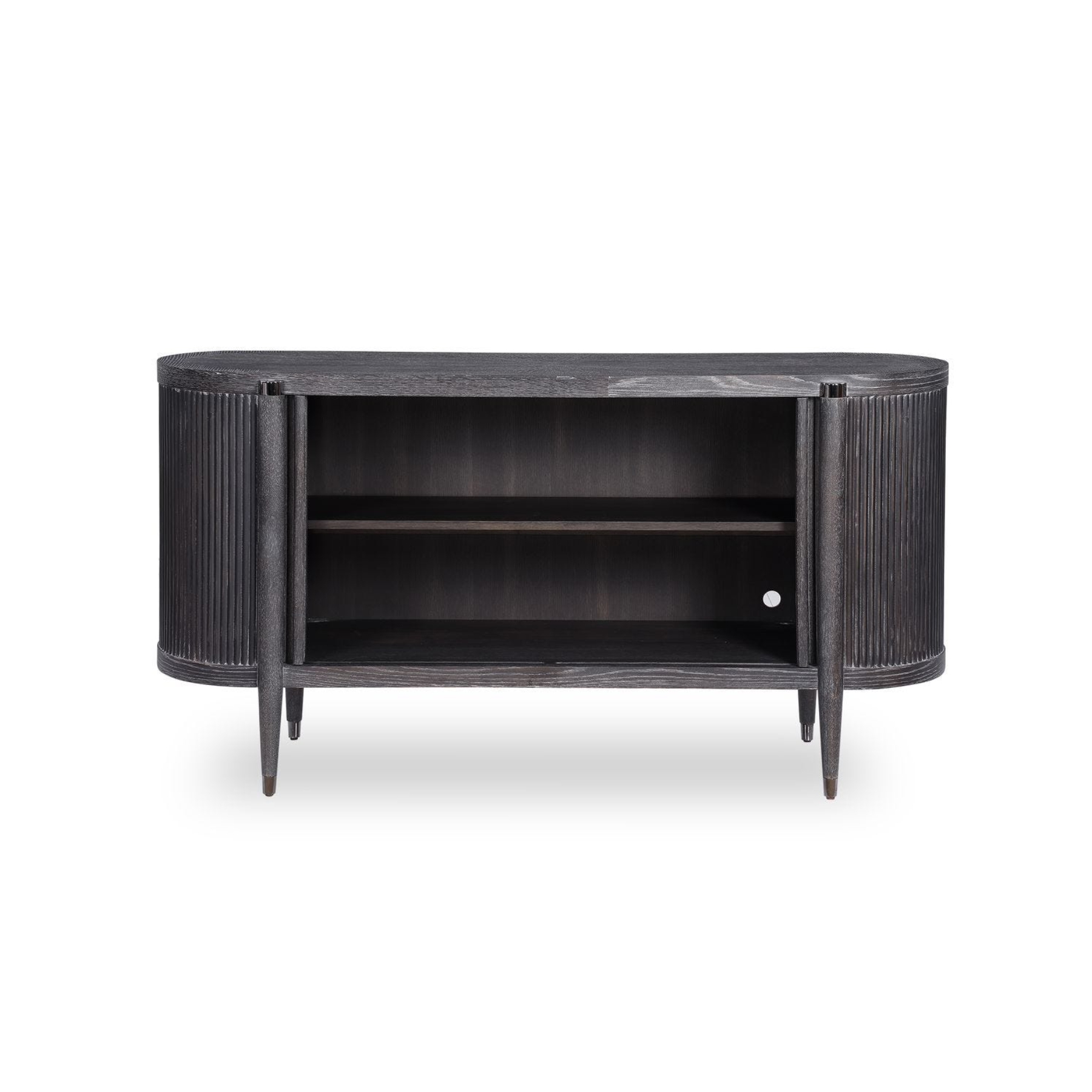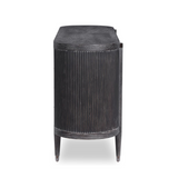 Constructed from American white oak and solid poplar wood, the Tamboura Cabinet boasts a sleek black cerused finish. This refined piece features solid oak half-round flutes accented with polished black nickel metal caps, making it an ideal addition to any room. It also offers practical storage for electronics, with an adjustable shelf inside.
